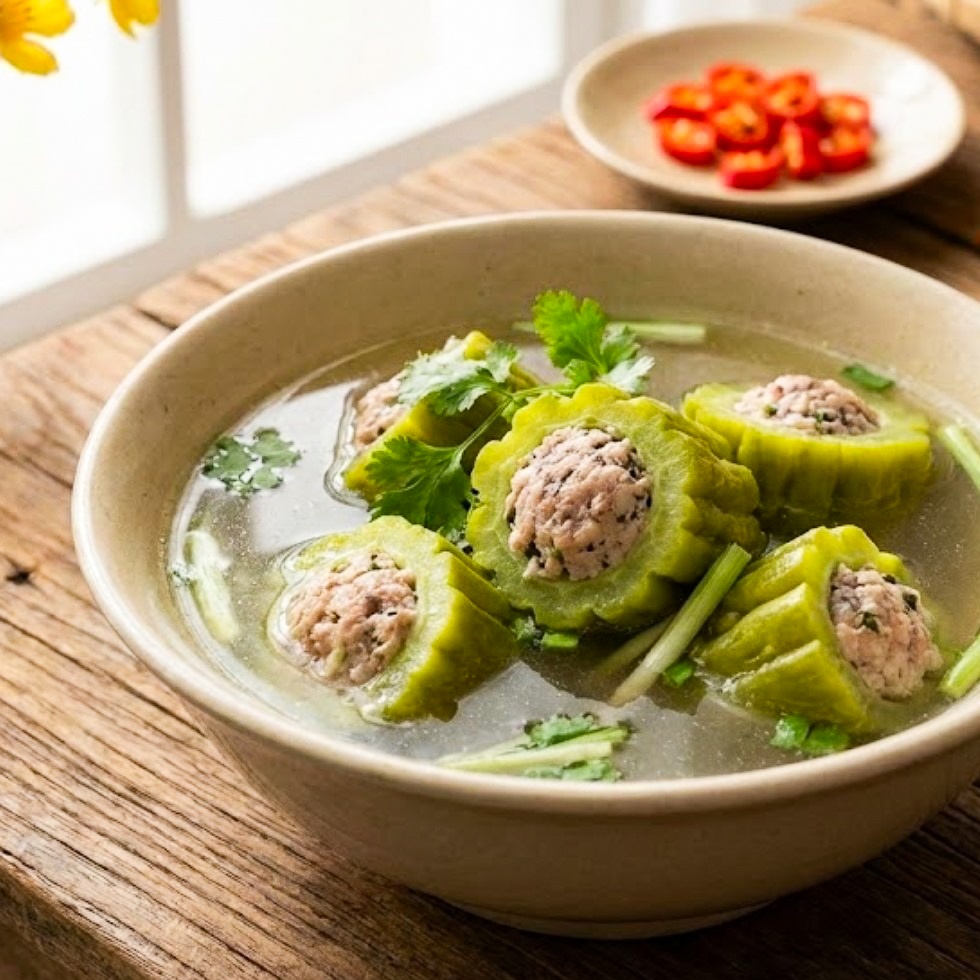 มะระยัดไส้เนื้อสับและเห็ดหูหนู นำไปต้มจนนุ่ม เป็นสัญลักษณ์ของความอุดมสมบูรณ์และความเจริญรุ่งเรือง นอกเหนือจากความหมายทางจิตวิญญาณแล้ว มะระยังอุดมไปด้วยวิตามินซี สารต้านอนุมูลอิสระ และสารประกอบจากธรรมชาติที่เป็นประโยชน์ต่อการควบคุมระดับน้ำตาลในเลือด ทำให้เป็นยาสามัญประจำบ้านที่ใช้ในการบรรเทาความร้อนในร่างกายและล้างพิษ