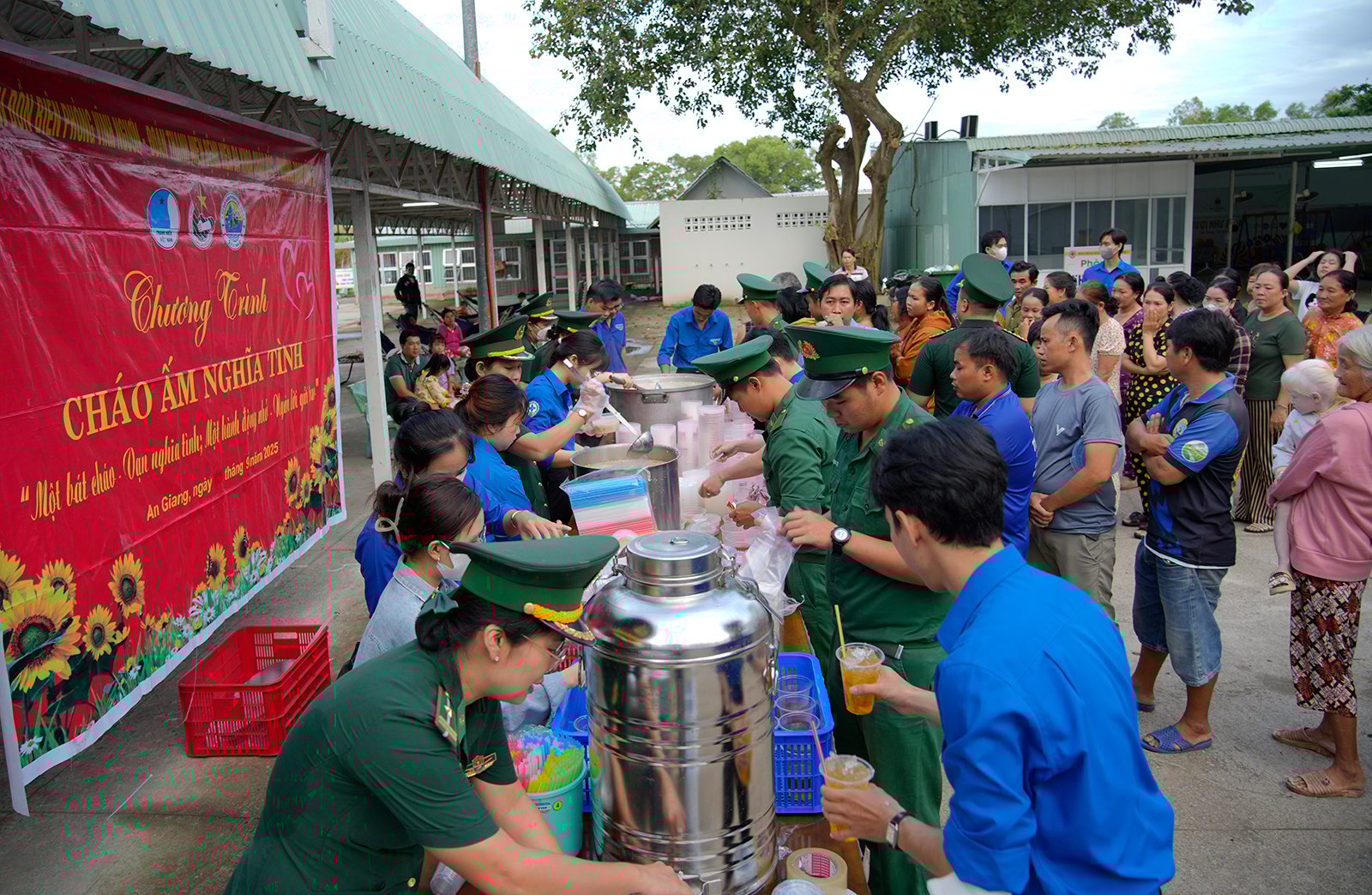 นางเหงียน ถิ มุง ชาวบ้านในตำบลบิ่ญมี จังหวัด อานซาง รู้สึกซาบซึ้งใจเมื่อได้รับโจ๊กจากเจ้าหน้าที่ชายแดนว่า “ฉันกำลังเลี้ยงหลานอยู่ที่แผนกกุมารเวช ครอบครัวของฉันอยู่ในสถานการณ์ที่ยากลำบาก แต่เมื่อมาถึงที่นี่ เจ้าหน้าที่ชายแดนก็ให้โจ๊กและน้ำแก่ฉัน ฉันรู้สึกอบอุ่นและประหยัดค่าอาหารเช้า ฉันหวังว่าเจ้าหน้าที่ชายแดนจะมีสุขภาพแข็งแรงขึ้น เพื่อทำโจ๊กช่วยเหลือผู้ยากไร้ที่นี่…”