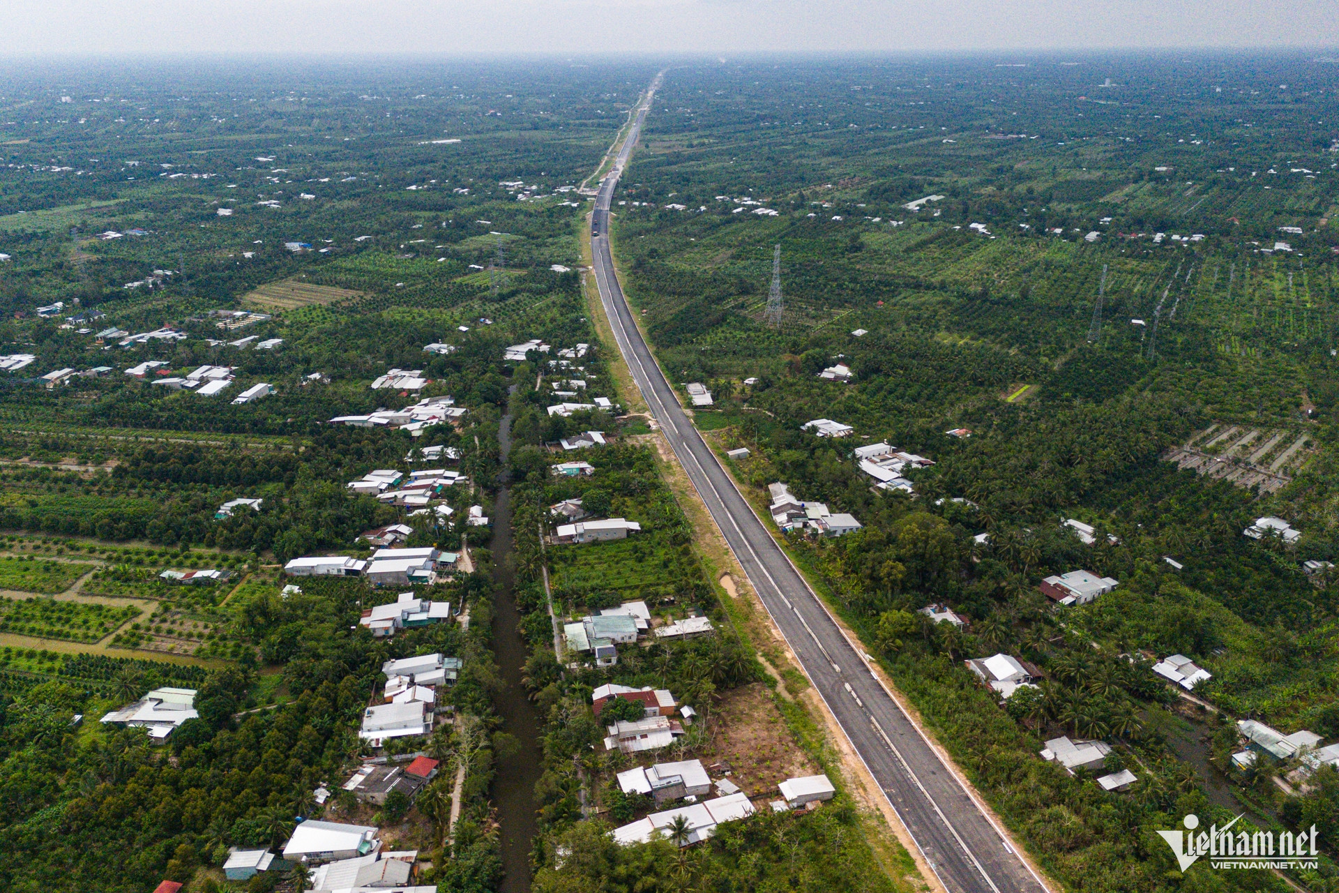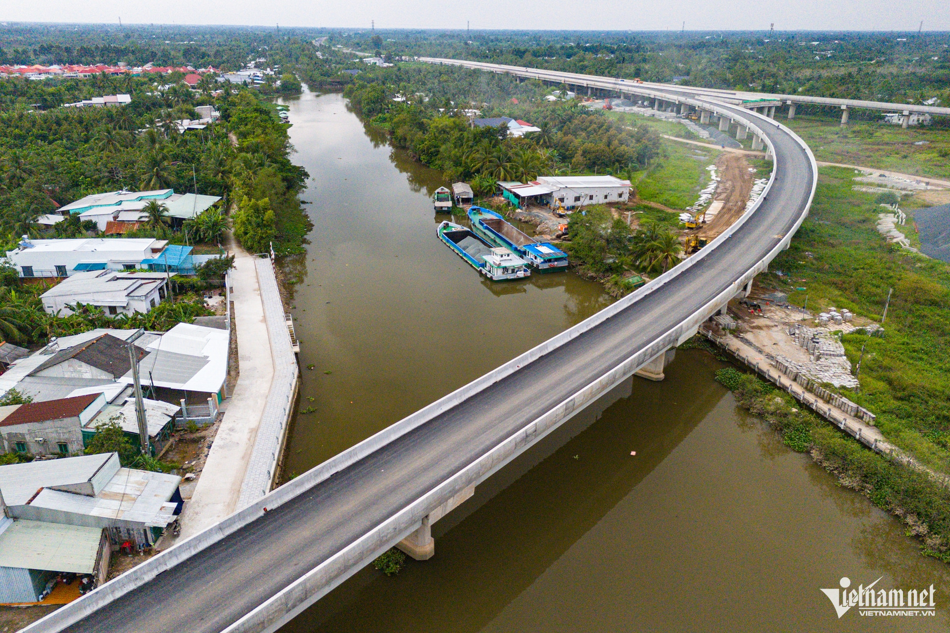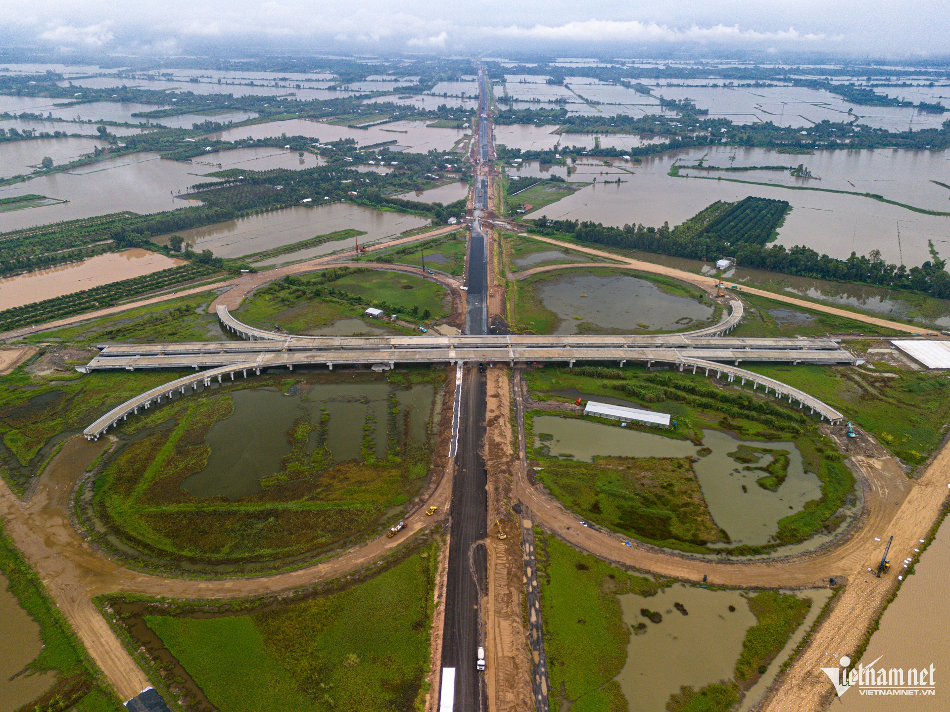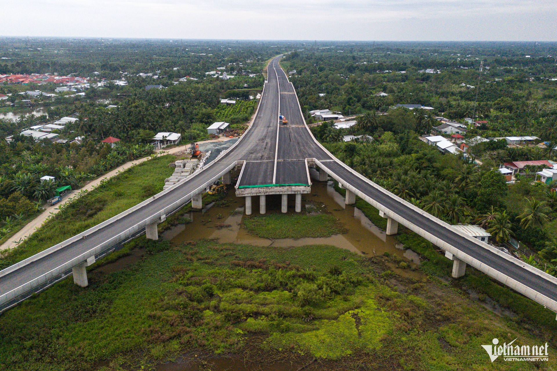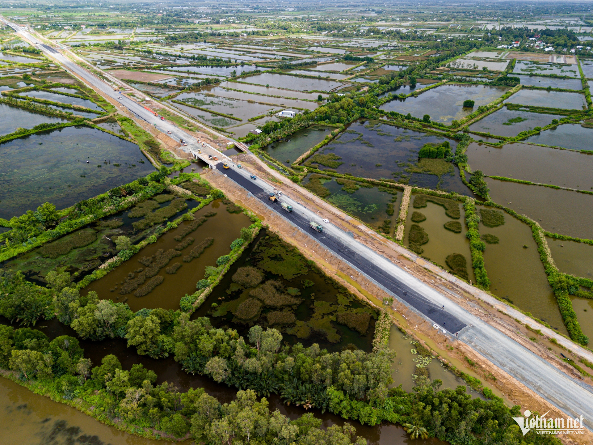 กลางเดือนพฤศจิกายน ส่วนที่เชื่อมต่อถนนวงแหวนตะวันตก ของเมืองกานโธ กับทางด่วนได้รับการปูผิวแล้ว รอดำเนินการในส่วนอื่นๆ เช่น เครื่องหมายและไฟส่องสว่างให้แล้วเสร็จ ในภาพ ทางแยก IC2 ซึ่งเป็นจุดเริ่มต้นของเส้นทาง ได้รับการปูผิวแล้ว ติดตั้งราวกันตก และกำลังรอการทาสีเส้นทางเพื่อเปิดใช้งานพร้อมกัน