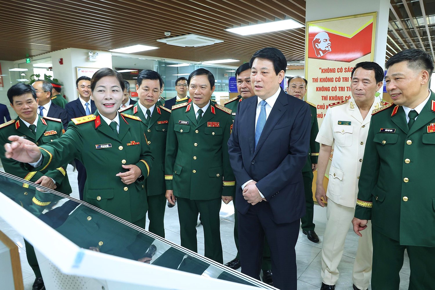 สมาชิก โปลิตบูโร และประธานาธิบดีเลืองเกวงเยี่ยมชมห้องสมุดของสถาบันการป้องกันประเทศ_ภาพ: VNA