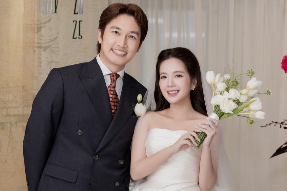 ดิงห์ ตู เลือกสวมเสื้อกั๊กสีเหลืองบรอนซ์อ่อนๆ คู่กับเสื้อเชิ้ตหลวมๆ ขณะที่เจ้าสาว ง็อก เฮวียน งดงามราวกับเจ้าหญิงใน เทพนิยาย ง็อก เฮวียน เลือกสวมชุดเดรสสั้นเปิดไหล่ที่ดูอ่อนเยาว์ สวมรองเท้าส้นสูง 20 ซม. เพื่อไม่ให้สูงต่างจากสามีรูปงามของเธอมากเกินไป ทั้งคู่ยิ้มอย่างมีความสุขอยู่หน้ากล้องในวันสำคัญของพวกเขา