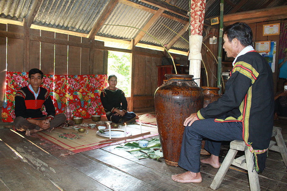 สิ่งของที่ใช้ในพิธีกรรมประกอบด้วย หมูตอน 1 ตัว ไวน์ 3 เหยือกใหญ่ แหวนทองแดง 6 วง ลูกปัด 3 เส้น ถ้วยทองแดง 3 ใบ ชามทองแดง 3 ใบ และถาดทองแดง 1 ใบ… ต้นโซอันมีความสำคัญอย่างยิ่ง เพราะถือเป็นสิ่งเชื่อมโยงระหว่างมนุษย์กับวิญญาณ ภายในบ้านยาว จะมีการตั้งเสาไวน์และตกแต่งด้วยสีสันและลวดลายต่างๆ ถัดจากนั้นคือเหยือกไวน์ 3 เหยือกใหญ่ที่ผูกติดกับเสาอย่างแน่นหนาด้วยเถาวัลย์ป่า วงดนตรีฆ้องของหมู่บ้านจะบรรเลงเพลงต้อนรับเพื่อเชิญญาติมิตรจากทั้งใกล้และไกลมาร่วมงาน
