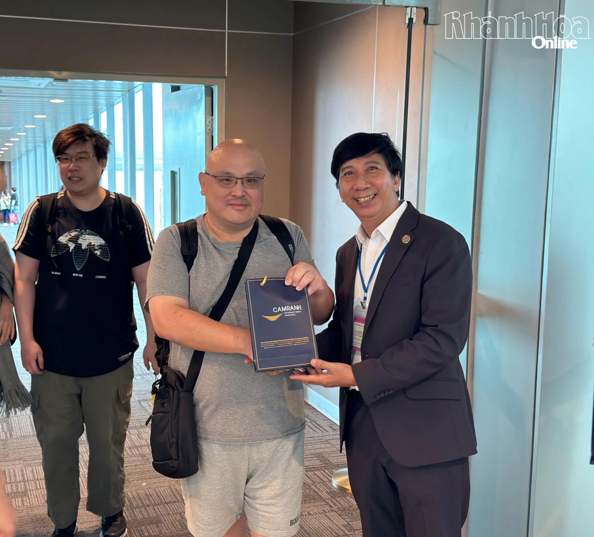| ผู้บริหารกรมวัฒนธรรม กีฬา และการท่องเที่ยว มอบของขวัญให้กับผู้โดยสารบนเที่ยวบินจากสิงคโปร์ไปยังคั๊ญฮหว่า |