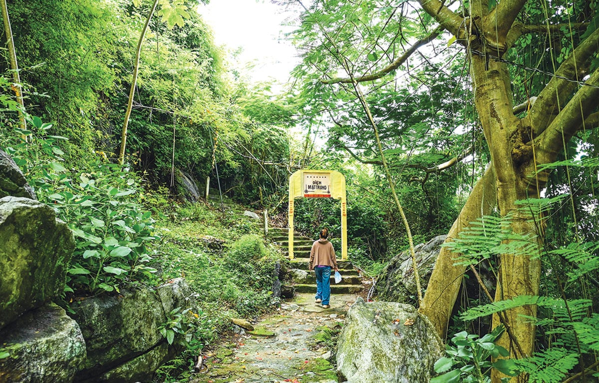 ตามคำบอกเล่าของนายเหงียน บินห์ อัน ชาวบ้านในพื้นที่ เส้นทางสู่วัดจันทร์มีบันไดหินประมาณ 600 ขั้นให้ผู้มาเยือนได้พิชิต นักท่องเที่ยวจากที่ไกลๆ สามารถชื่นชมความงามส่วนใหญ่ของชนบทบนเกาะฮอนได้จากมุมสูง ทุ่งนาอันกว้างใหญ่ทอดยาวราวกับกระจก มองเห็นบ้านเรือนหลังคากระเบื้องสีแดงสดเรียงรายอยู่ข้างคลองที่เงียบสงบ เต็มไปด้วยตะกอนที่หล่อเลี้ยงทุ่งนาอันอุดมสมบูรณ์ ในระยะไกล เกาะเต่าก็โผล่ขึ้นมาจากมหาสมุทรอย่างงดงาม… “ไม่มีอะไรสำคัญไปกว่าความจริงที่ว่าท่ามกลางความวุ่นวายของชีวิต ภูเขา ป่าไม้ และเนินเขาสูงตระหง่านมอบความสงบและสถานที่ให้เราได้ไตร่ตรอง” นายอันกล่าว