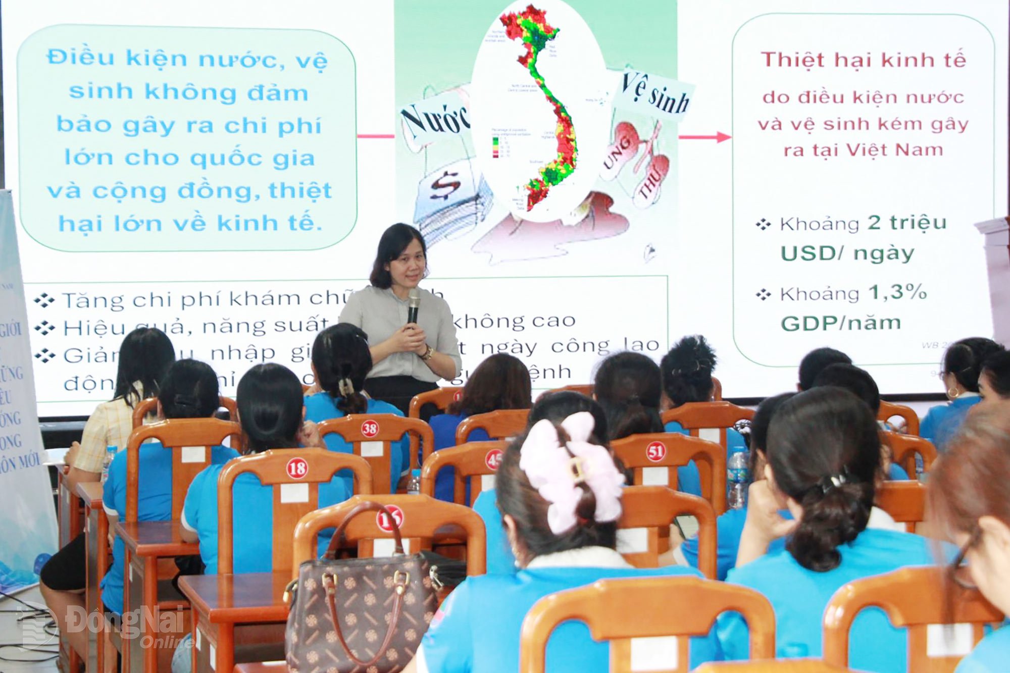คุณเหงียน ถิ ถั่น ถวี รองหัวหน้าฝ่ายกิจการสตรี สหภาพสตรีเวียดนาม กล่าวถึงบทบาทของสหภาพในทุกระดับ สมาชิก และสตรีในการดำเนินตามแนวทาง "3 สะอาด" ภาพ: งา เซิน |