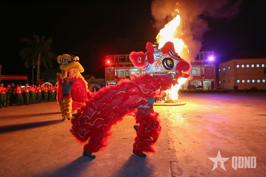 | กองพันที่ 1 กรมที่ 738 กองบัญชาการทหารจังหวัดเตย์นินห์ จัดงานก่อกองไฟและแสดงระบำสิงโตเพื่อเฉลิมฉลองวันส่งท้ายปีเก่าต้อนรับปีใหม่ |
