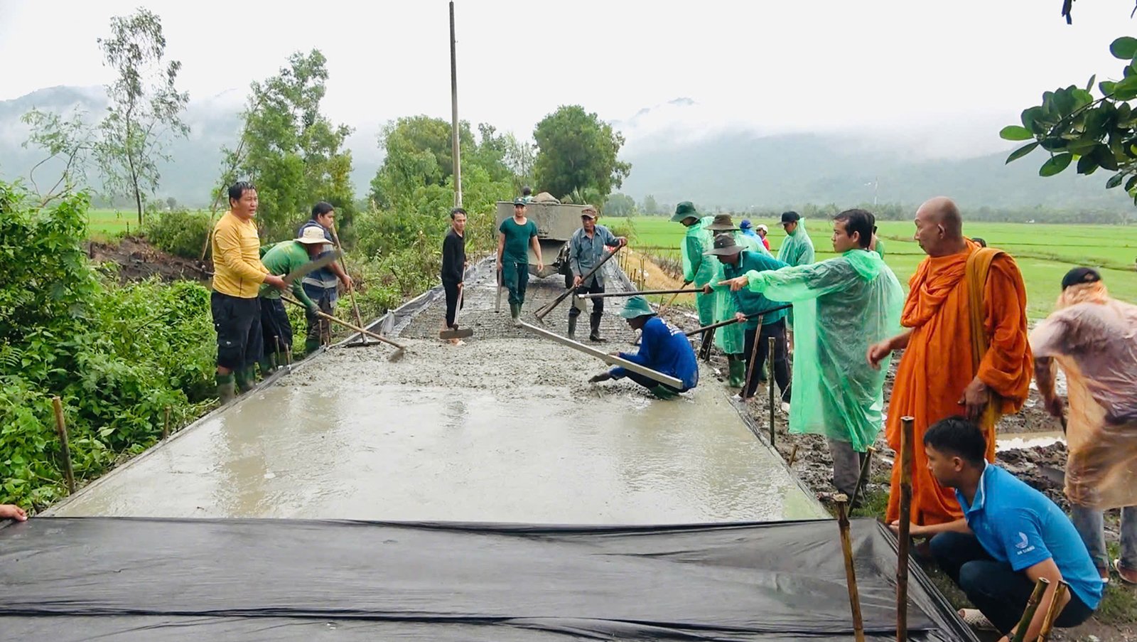 พระเชา เซิน ฮี ระดมพลประชาชนบริจาคเงินและวันทำงานเพื่อสร้างถนนคอนกรีตในหมู่บ้านต่างๆ ภาพ: MY HANH