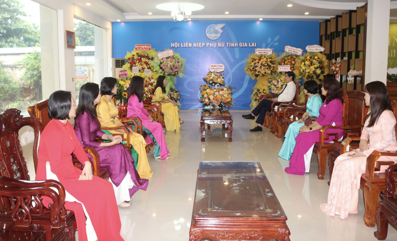 รองประธานคณะกรรมการประชาชนจังหวัด คุณ Lam Hai Giang เป็นตัวแทนมอบตะกร้าดอกไม้แสดงความยินดีกับสหภาพสตรีจังหวัด