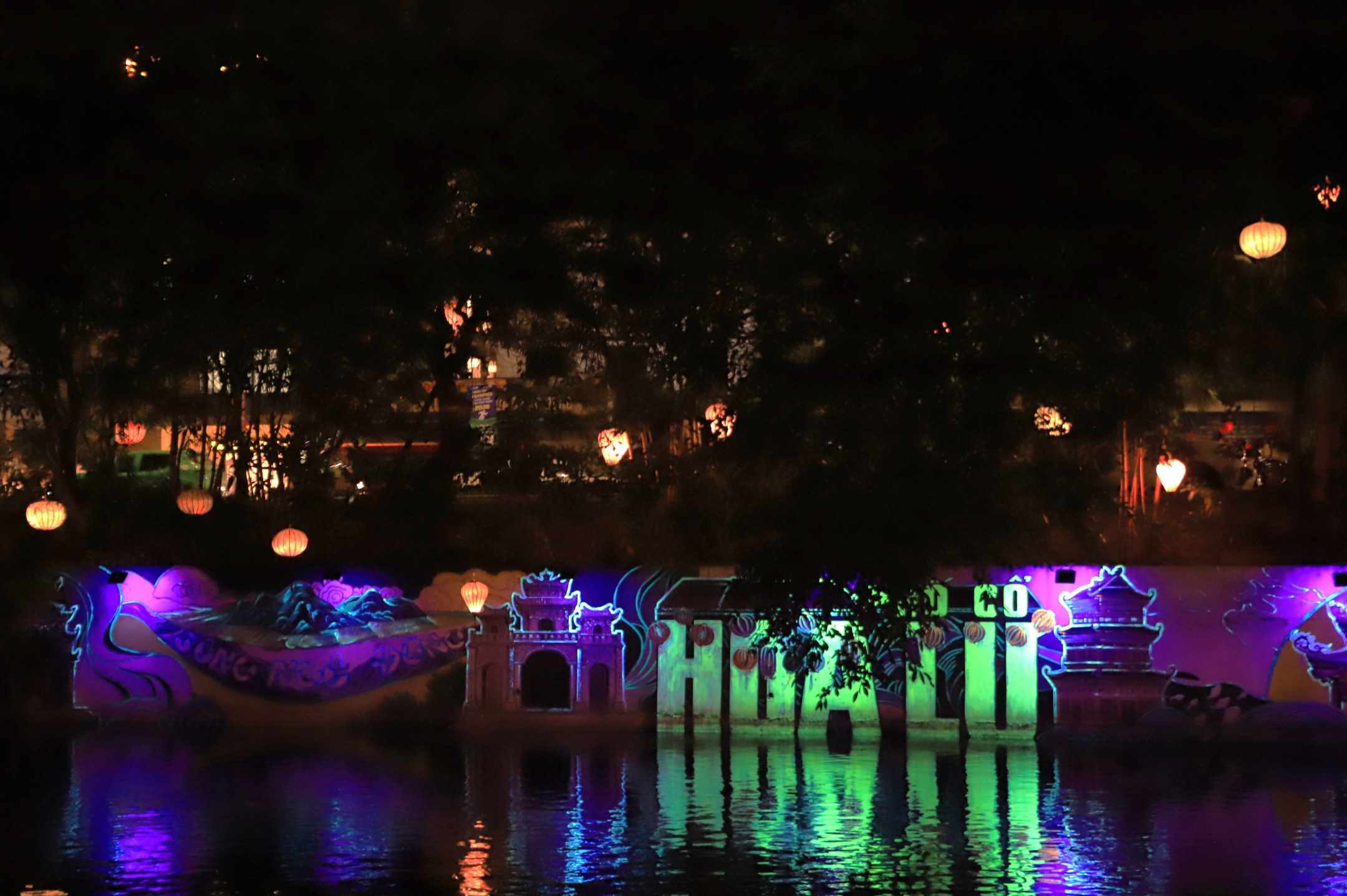 แสงไฟและงานศิลปะบนผนังผสานกันทำให้ทะเลสาบกี๋หลานดูงดงามตระการตา