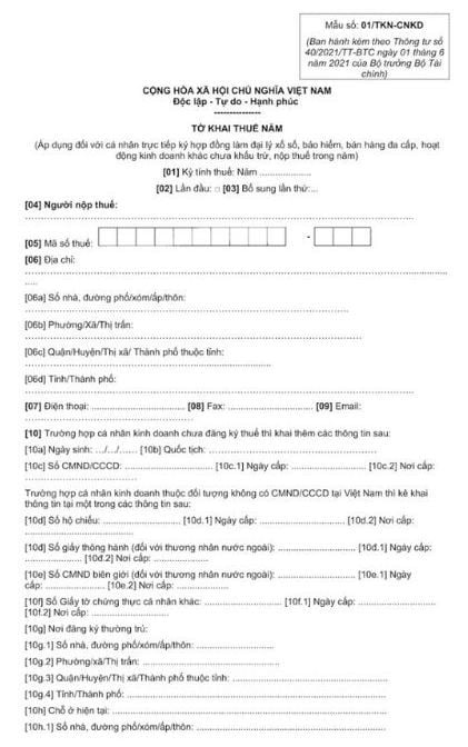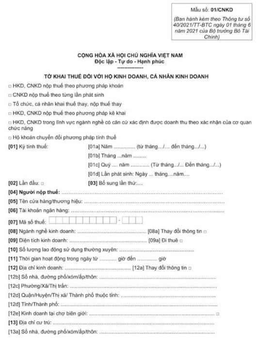 แบบฟอร์ม 01/CNKD: การยื่นภาษีมูลค่าเพิ่มและภาษีเงินได้บุคคลธรรมดาสำหรับบุคคลธรรมดาทางธุรกิจ