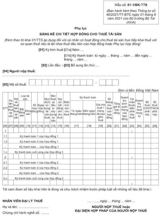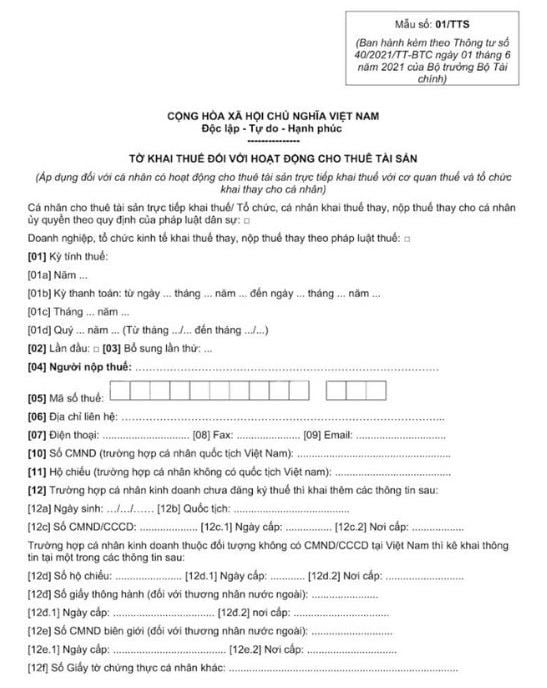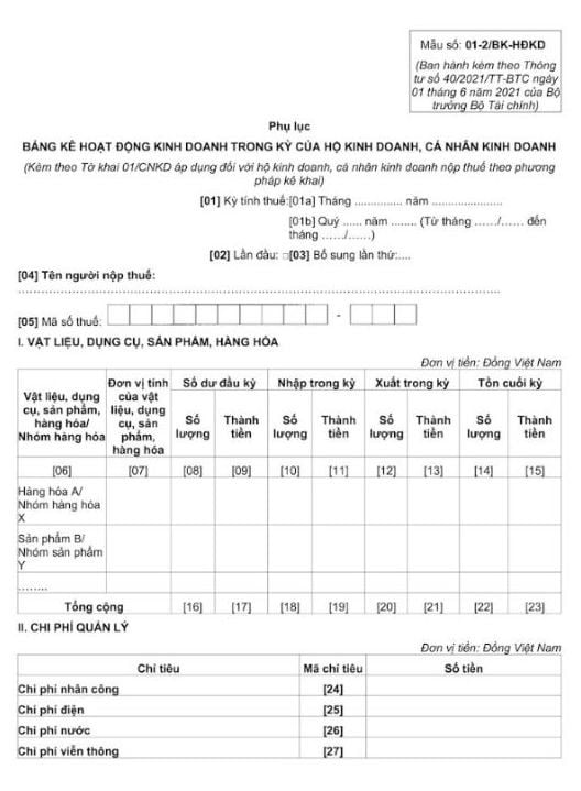 แบบฟอร์มการประกาศที่ใช้กันทั่วไปสำหรับครัวเรือนธุรกิจระบุไว้ในภาคผนวกที่ออกพร้อมกับหนังสือเวียน 40/2021/TT-BTC ซึ่งรวมถึง: