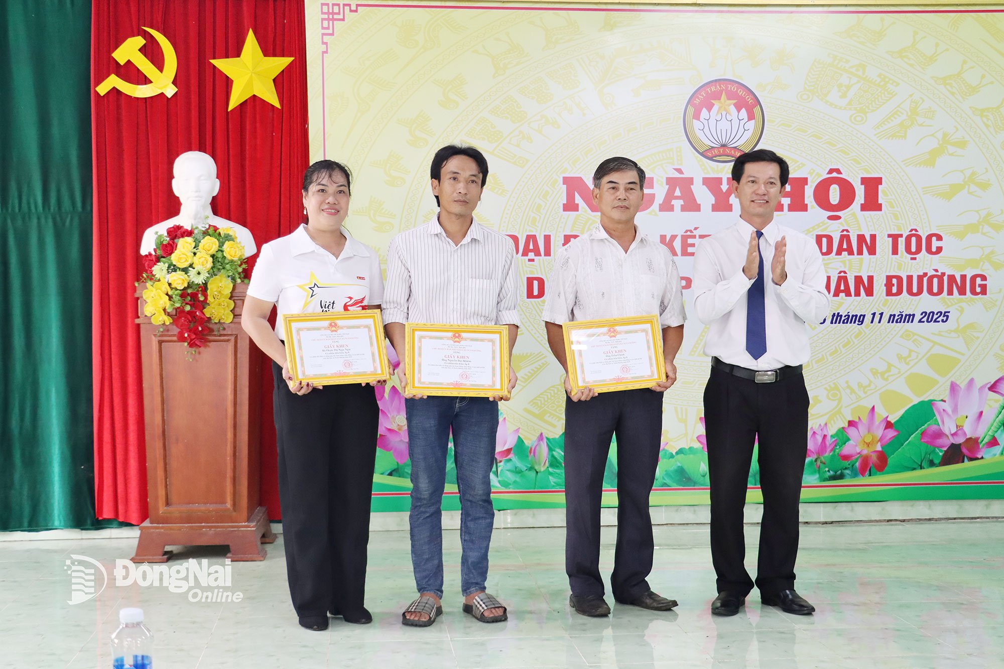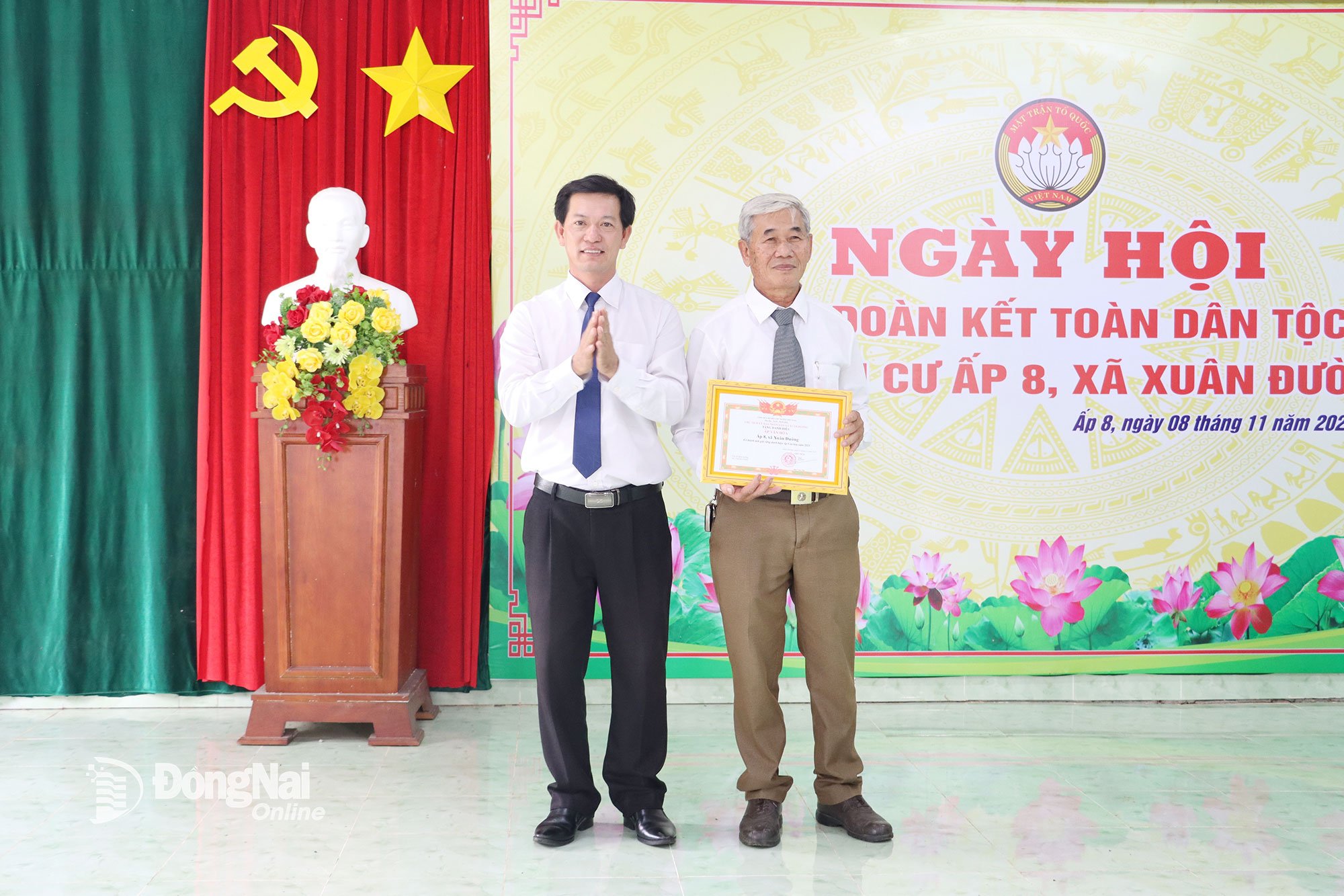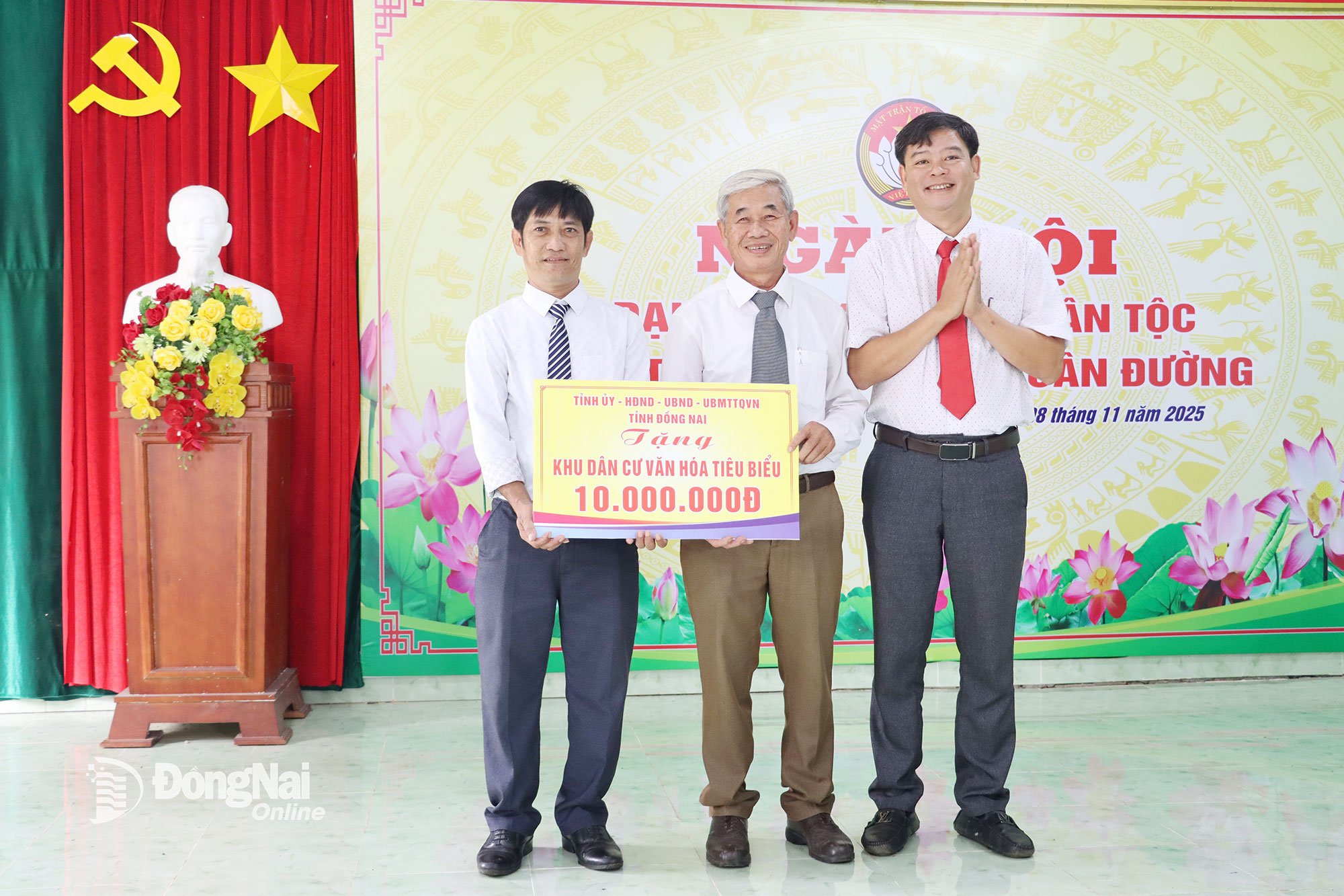 | ผู้นำตำบลซวนเดืองได้มอบโล่ประกาศเกียรติคุณและโล่รางวัลจากคณะกรรมการพรรคประจำจังหวัด - สภาประชาชน - คณะกรรมการประชาชน - คณะกรรมการแนวร่วมปิตุภูมิเวียดนาม จังหวัด ด่งนาย ให้แก่ชุมชนที่อยู่อาศัยทางวัฒนธรรมอันเป็นเอกลักษณ์ ภาพโดย: วัน ดวน |