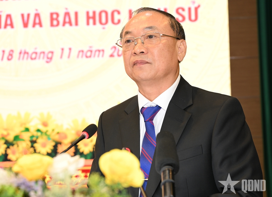 | พลโท รองศาสตราจารย์ ดร. หวู่ เกือง กวีเยต ผู้อำนวยการสถาบันยุทธศาสตร์และประวัติศาสตร์การป้องกันประเทศเวียดนาม กล่าวสุนทรพจน์ |