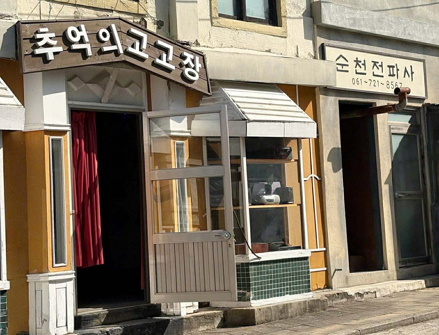 Sau hơn hai tiếng di chuyển, chúng tôi đặt chân đến Suncheon. Trước mắt tôi là cả một thị trấn thời xưa tái hiện sống động: những con hẻm bê tông cũ kỹ, các căn nhà mái tôn sậm màu, biển hiệu màu chữ phai theo thời gian. Hai bên đường là những cửa tiệm bán món ăn vặt cổ, các quán rượu truyền thống với mùi pajeon thơm phức. Ấn tượng nhất với tôi là một rạp chiếu phim phong cách cũ và khu triển lãm trưng bày ảnh, poster và những bộ phim từng quay tại đây. Tất cả hòa lại thành bức tranh chân thật về đời sống người Hàn trong thời kỳ còn nhiều gian khó nhưng giàu nghị lực.