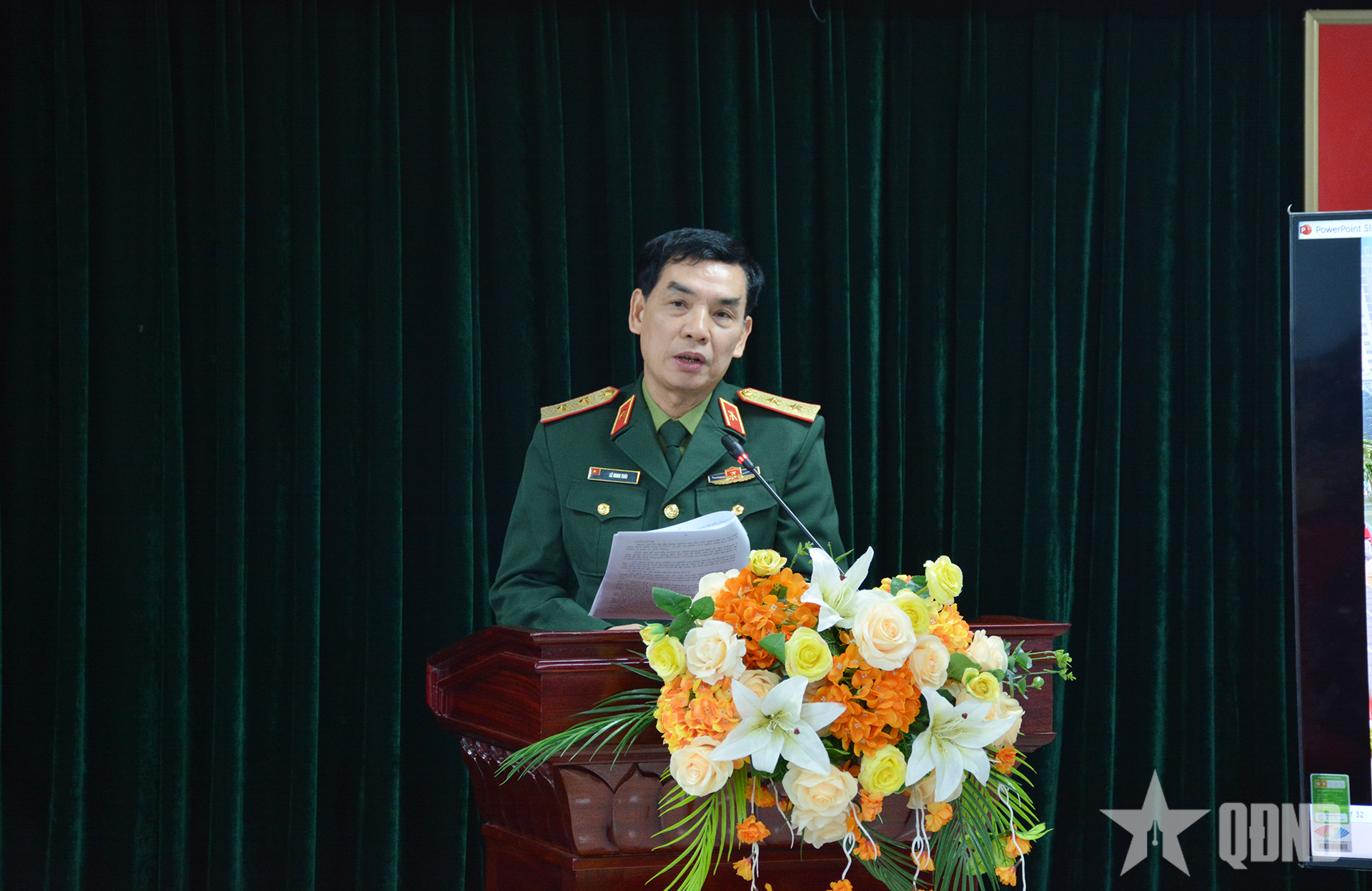 | Trung tướng, GS, TS Lê Minh Thái, Giám đốc Học viện Kỹ thuật Quân sự trình bày báo cáo. |