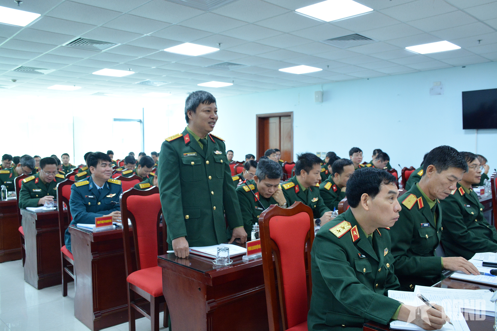 | Cán bộ Học viện Kỹ thuật Quân sự tham gia ý kiến thảo luận tại buổi làm việc. |