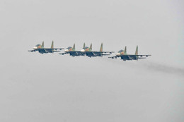 7 chiếc máy bay Su30-MK2 cùng 7 trực thăng Mi bay lượn trên bầu trời khu vực Gia Lâm, Long Biên (Hà Nội), tập dượt chuẩn bị cho lễ khai mạc Triển lãm Quốc phòng quốc tế Việt Nam 2024.