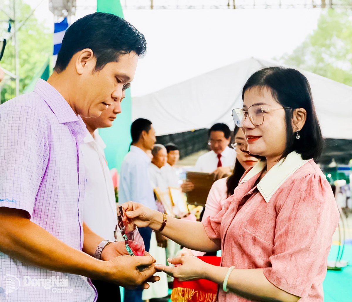 | Phó Giám đốc Sở Nông nghiệp và Môi trường Lê Thị Ánh Tuyết trao biểu trưng công nhận nông dân tiêu biểu năm 2025. Ảnh: B.Nguyên |