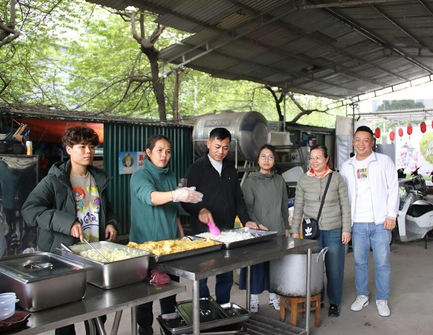 Bayan Thuy (soldan ikinci) ve arkadaşları yemek dağıtımına yardım etmek için geldiler. Fotoğraf: Hai Ly |