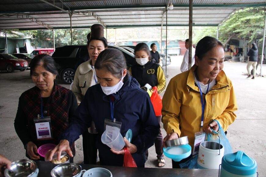 Bayan Thuy, yemekleri dağıtmak için strafor kutular kullanmak yerine, herkesin kendi kaplarını getirmesini teşvik etti; bu hem daha sağlıklı hem de çevresel etkiyi azaltıyor. Fotoğraf: Hai Ly |