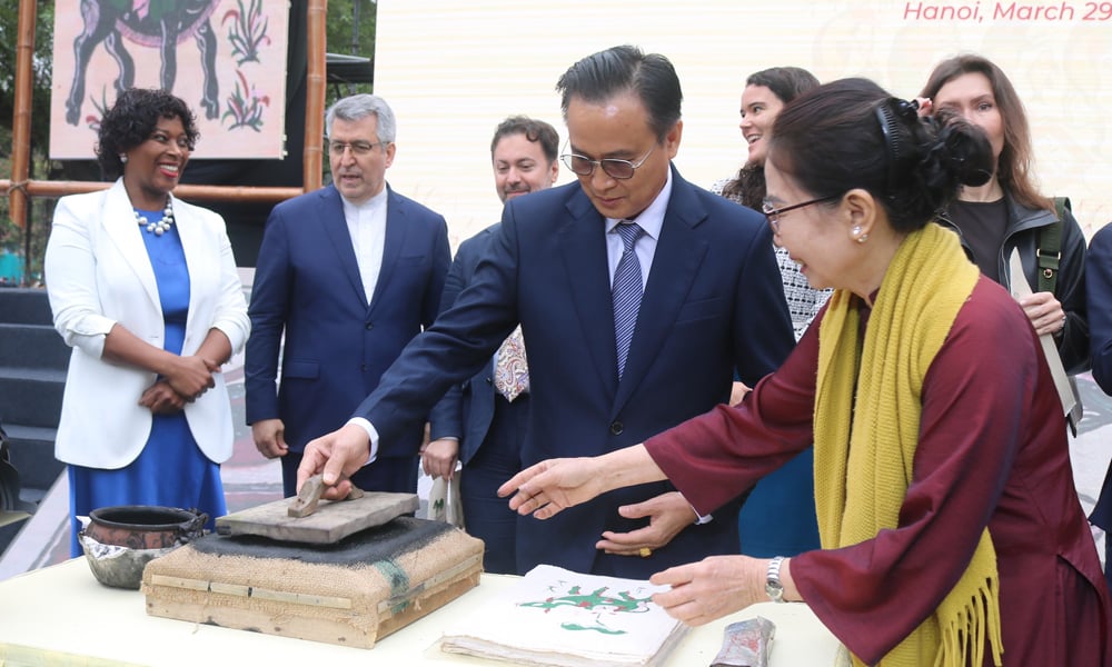 Hanoi'de düzenlenen "Kültürel özüm - Dong Ho renkleri" programı kapsamında uluslararası ziyaretçiler Dong Ho halk resimlerinin baskılarını deneyimlediler. |