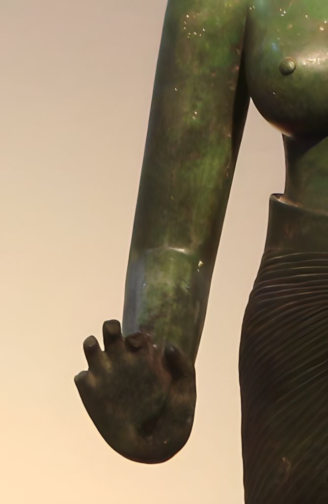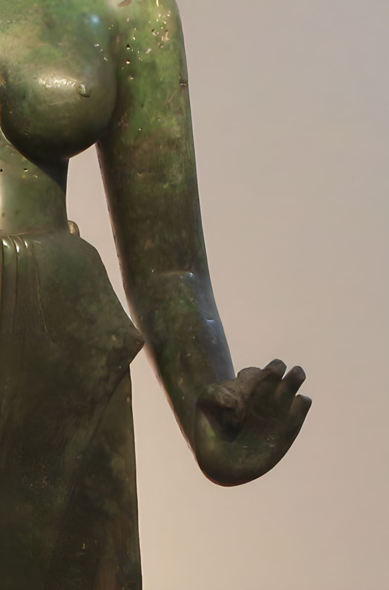 Heykelin hem sol hem de sağ elinde, ellerinde tuttuğu iki nesnenin, yani Bodhisattva'nın büyülü aletleri olan lotus ve salyangozun eksik olması nedeniyle kırıklar olduğu kolayca görülebilmektedir.