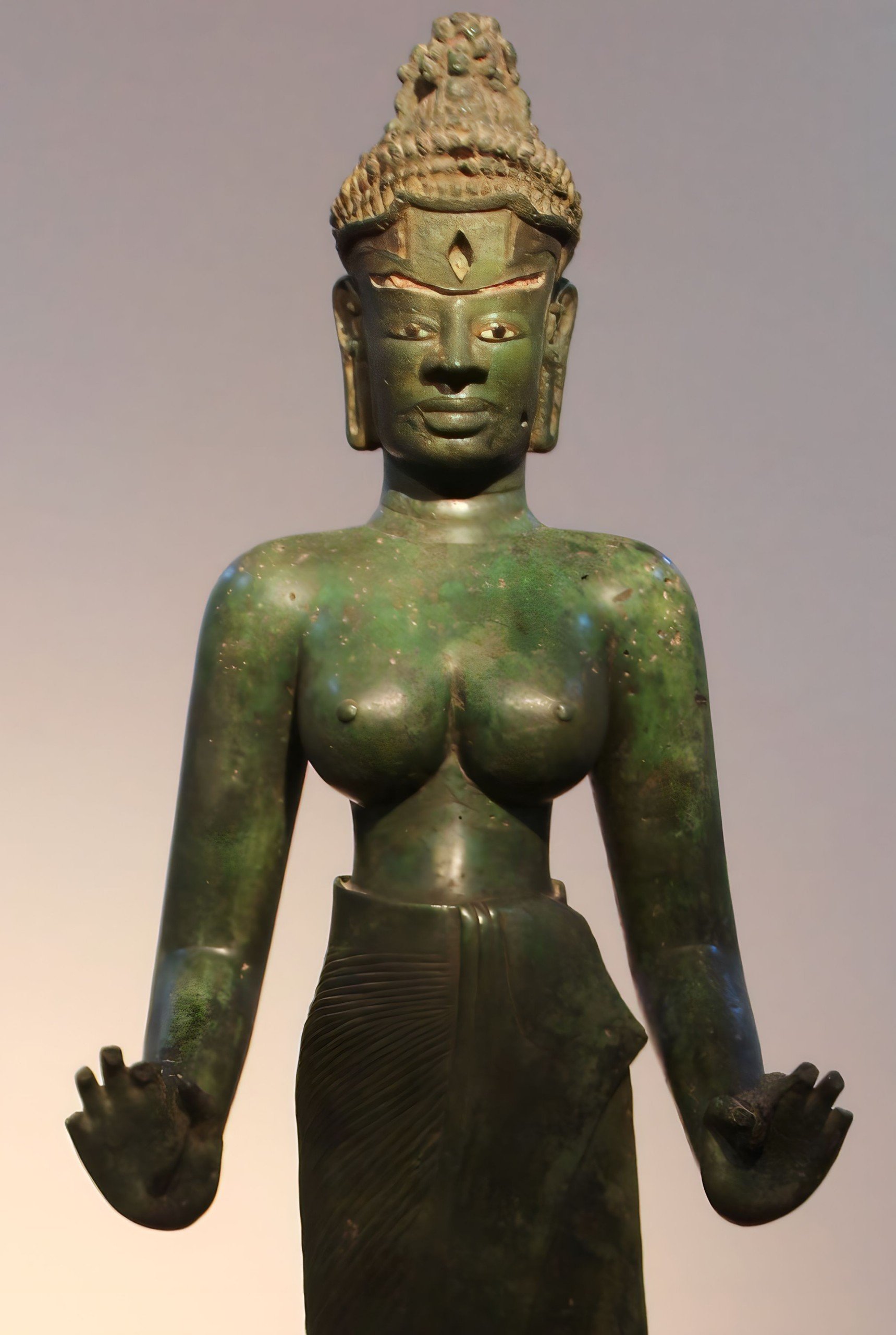 Saçları bir jata (sivri uç) şeklinde toplanmış tanrıça heykelinin tepesinde bir Amitabha Buda heykeli yer alıyor. Kare, ciddi yüzü, büyük, kavisli, kesişen kaşları, büyük burnu ve kalın dudakları... Dong Duong stilini çağrıştırıyor.
