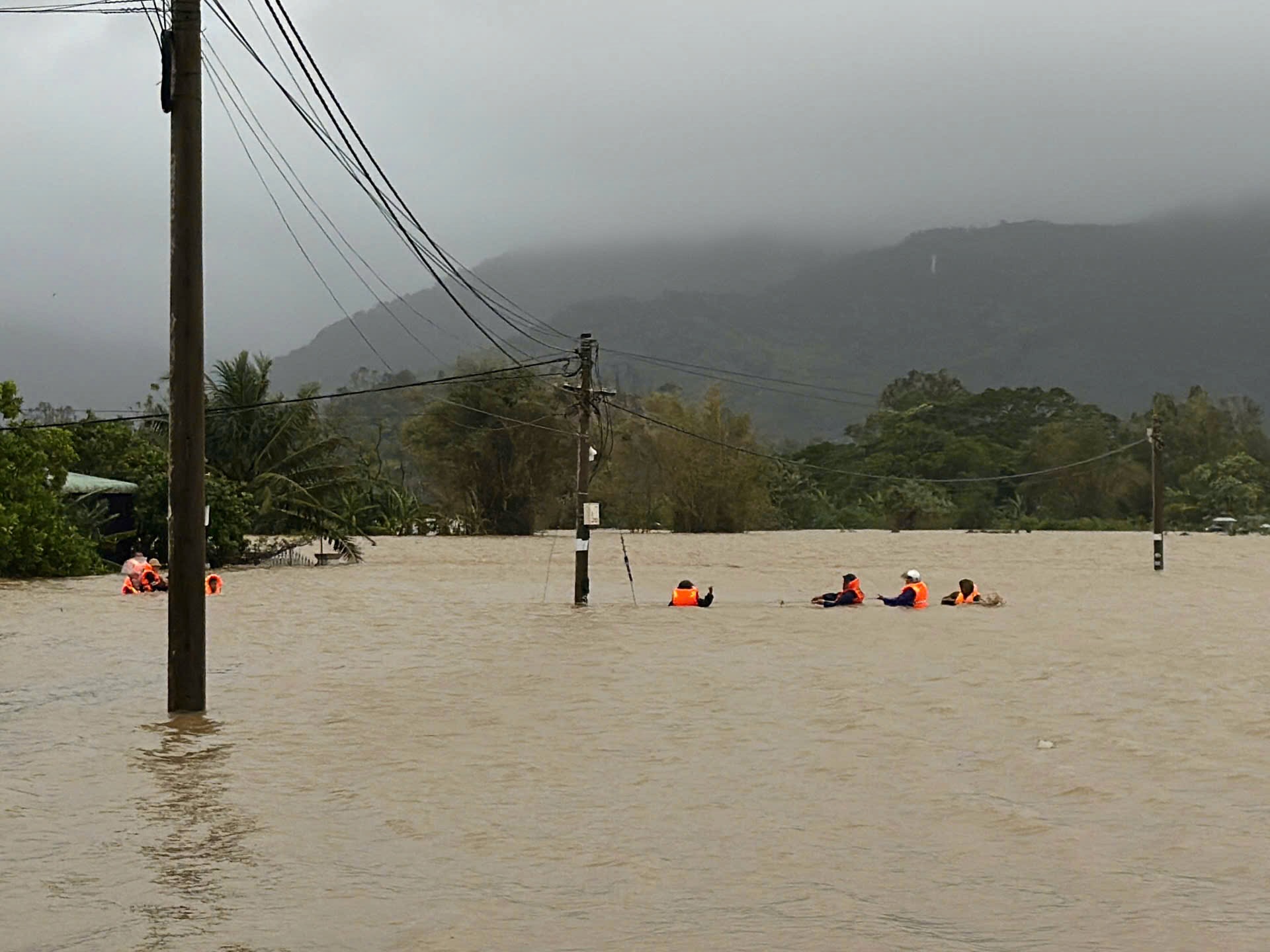 Kurtarma ekipleri derin su baskınlarına maruz kalan bölgelere ulaşmak için ip kullanıyor - Fotoğraf: MOC KHUE