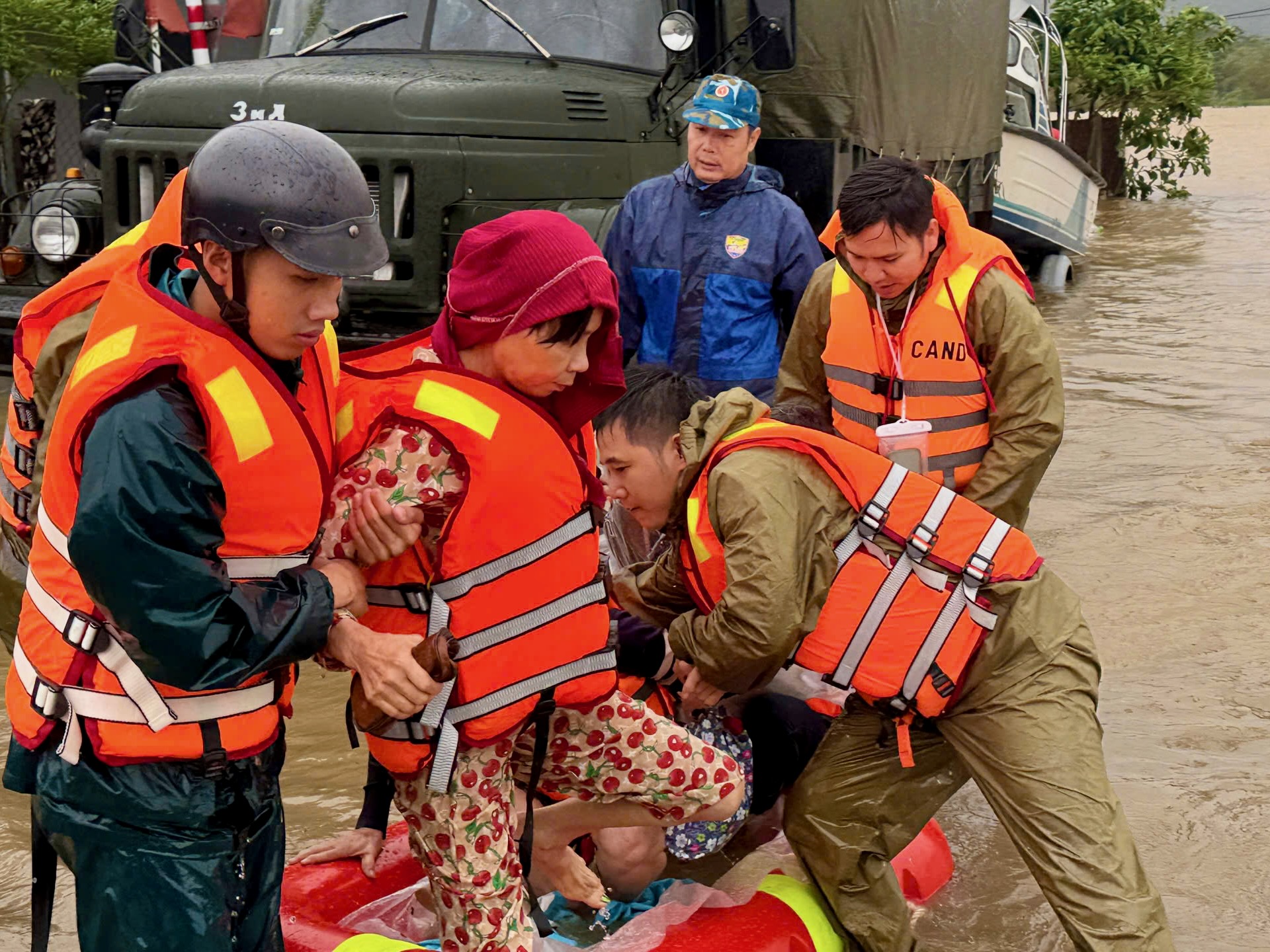 Bayan Phan Thi Dut (70 yaşında, Hoa Xuan komünü sakini), bugün öğleden sonra askerler ve polis tarafından kanoyla güvenli bir sığınağa götürüldüğünü söyledi. "Eklem ağrılarım var ama beni taşıyıp yardım etmekten çekinmediler, çok minnettarım. Evim şimdi boş, her yer sular altında," dedi Bayan Dut.