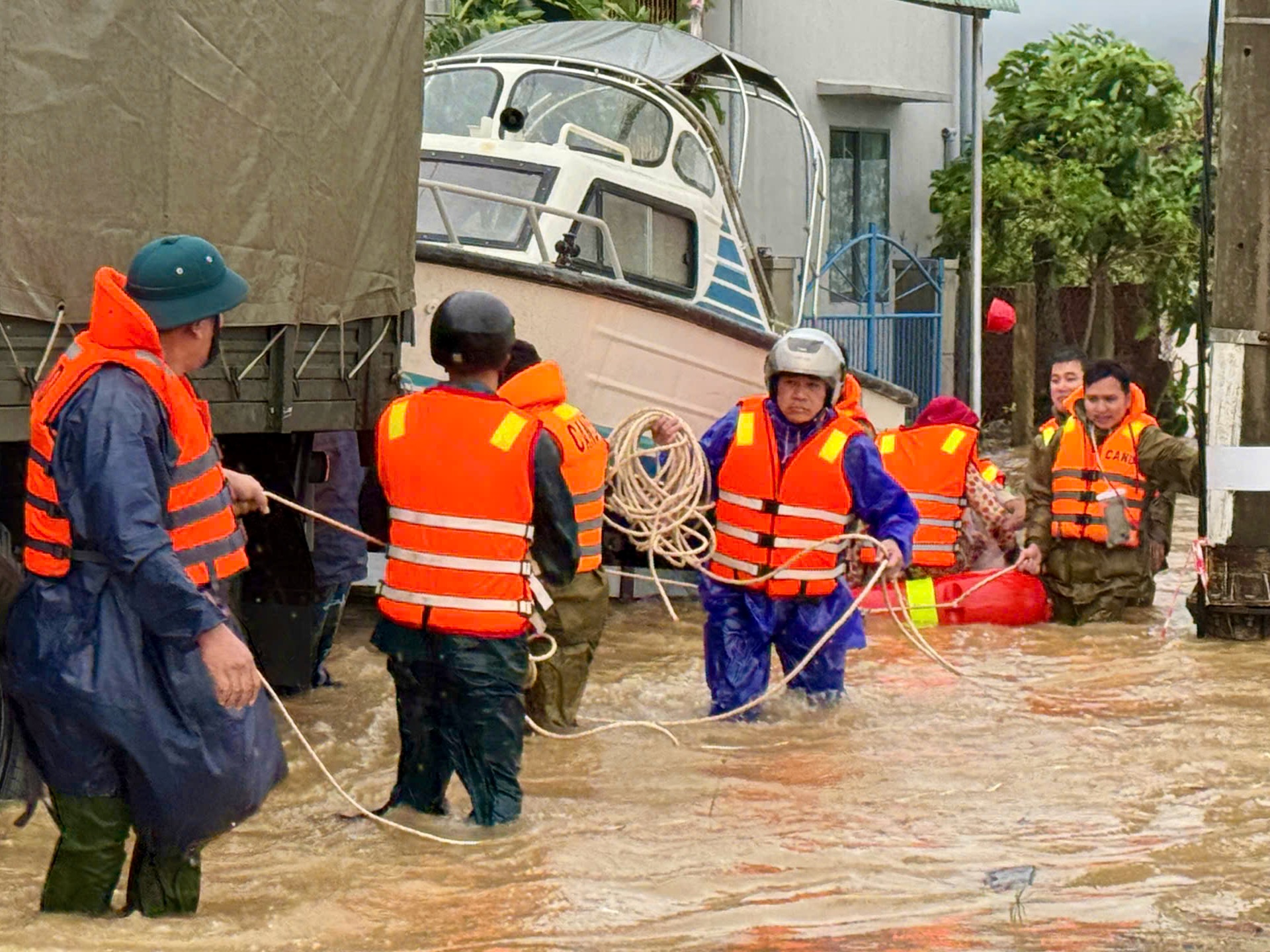 Kurtarma ekipleri, derin su baskınlarına maruz kalan bölgelere hareket etmeye veya insanların acil durum çağrılarına yanıt vermeye hazır - Fotoğraf: MOC KHUE
