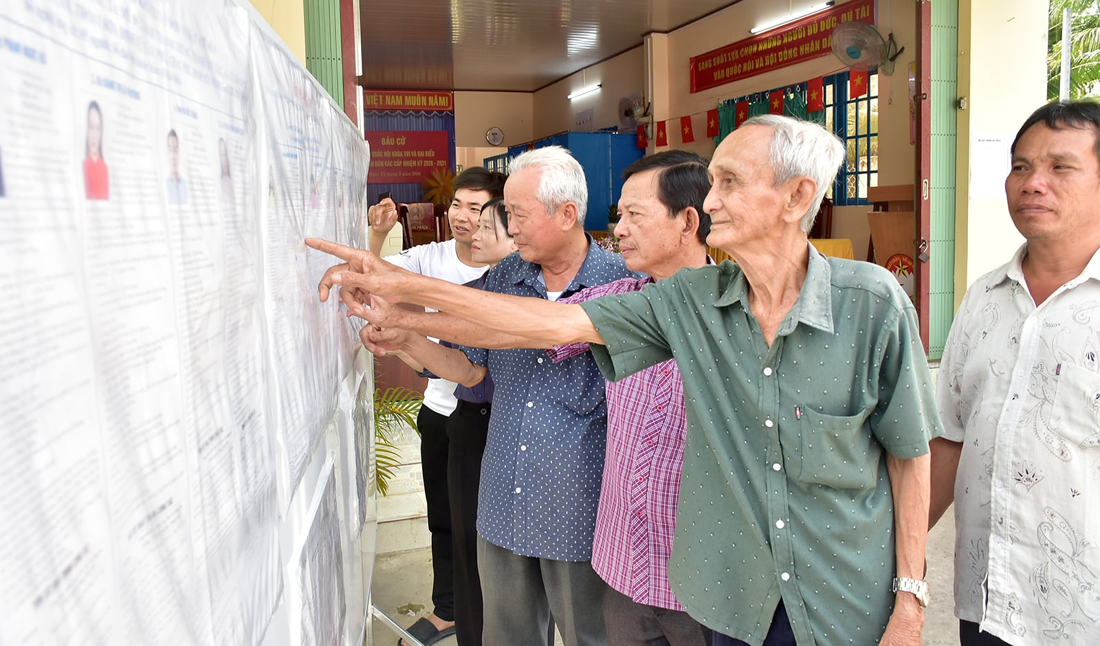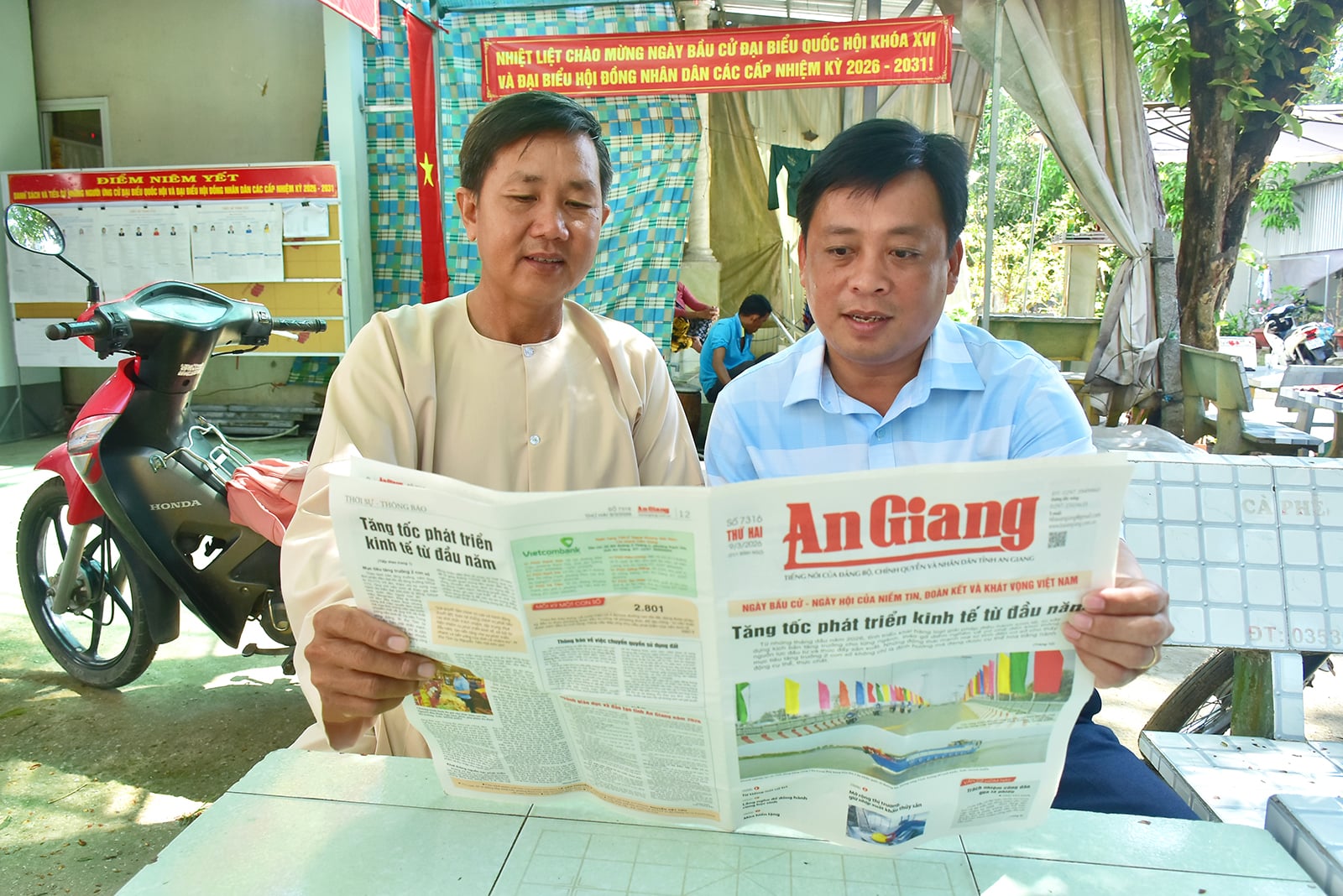 Seçmenler, An Giang Gazetesi aracılığıyla seçim süreci hakkında bilgi edinmeye çalışıyor. Fotoğraf: THANH TIEN