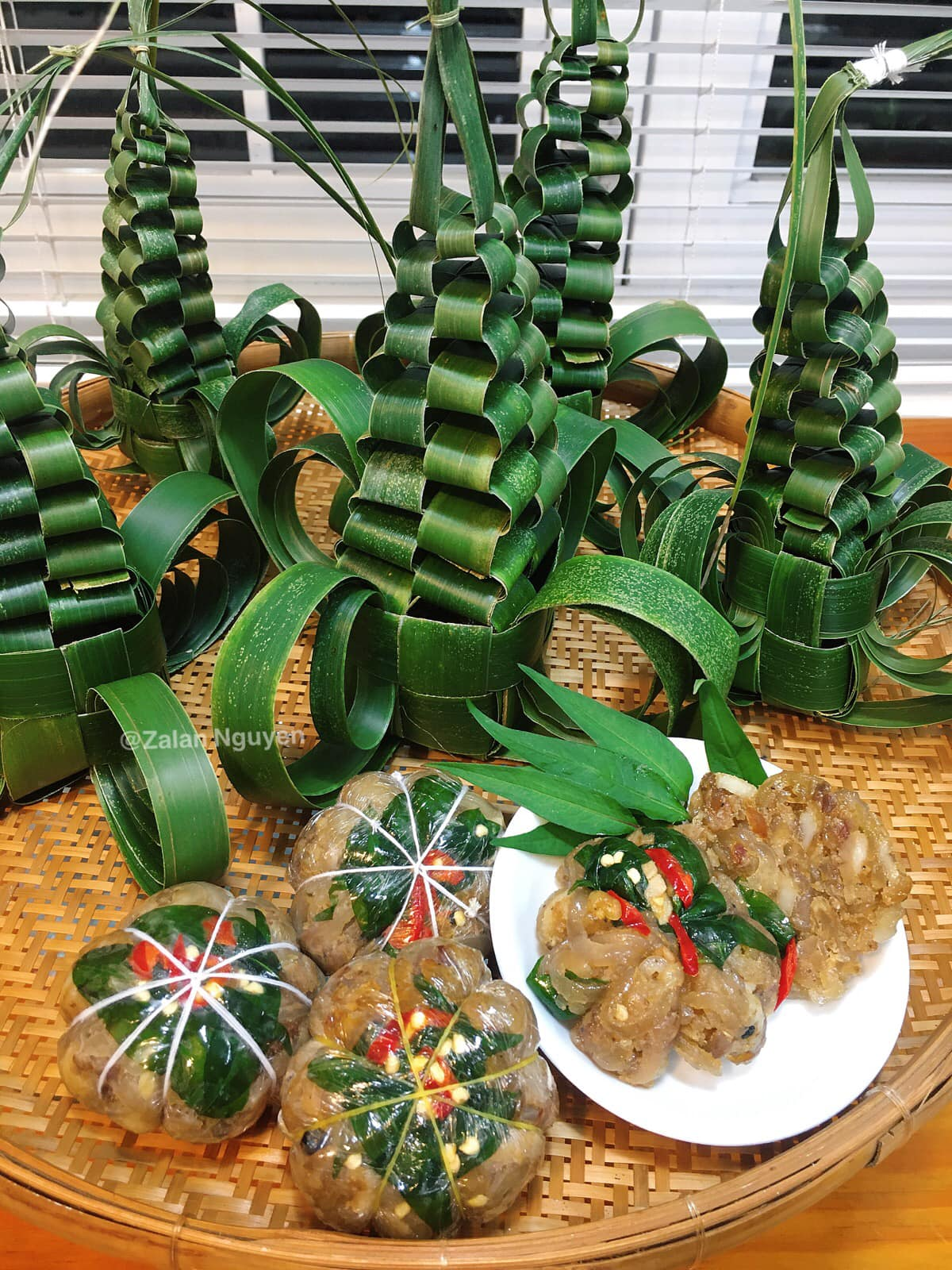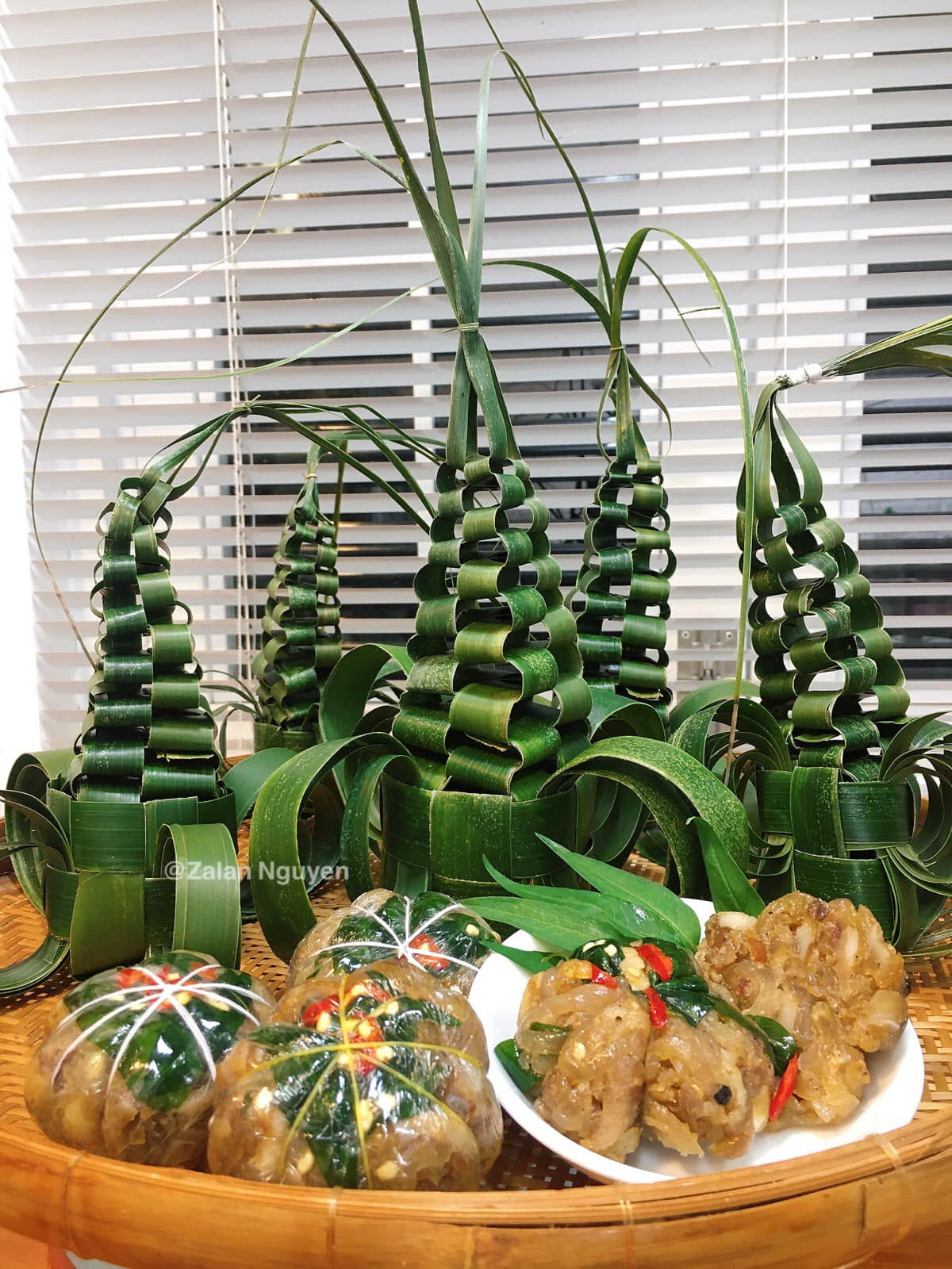 Bayan Thanh, bir kule yapmak için genellikle 5 hindistan cevizi yaprağının 10 parçaya bölünüp önce alttan, ardından dört kenardan örülmesi gerektiğini söyledi. Çin böreklerini kulenin ortasına yerleştirdikten sonra, sıkıca örerek çok katlı bir kule oluşturmaya devam ediyorlar.