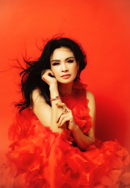 Thanh Lam, ipek elbisesiyle feminenlik ve zarafet saçıyor. Göz alıcı bir genel görünüm yaratmak için kıyafetini kırmızı bir saç tokası ve inci takılarla kombinledi.