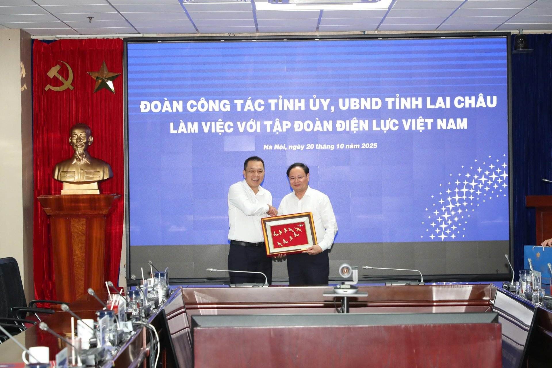 Vietnam Elektrik Grubu Yönetim Kurulu Başkanı Yoldaş Dang Hoang An, Lai Chau İl Parti Komitesi Sekreteri Yoldaş Le Minh Ngan'a bir hatıra hediyesi takdim etti.