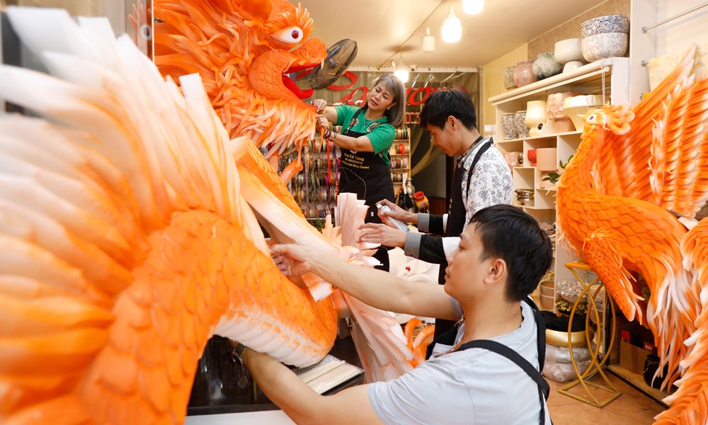 Hoa Cat Tuong işletme personeli Chu mahallesinin teşhir standını süslemek için ejderha ve anka kuşu maketlerini sergiliyor. |