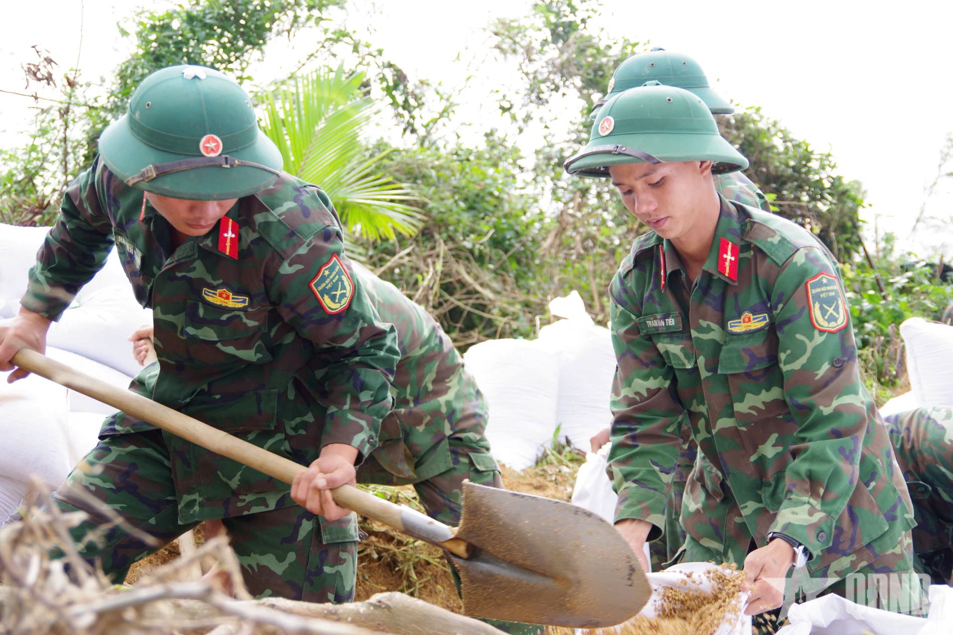 573. Tugay'ın (Askeri Bölge 5) subayları ve askerleri, Tuy Phuoc komününde ( Gia Lai ili) set gövdesini güçlendirmek için kum torbaları hazırlıyor. |