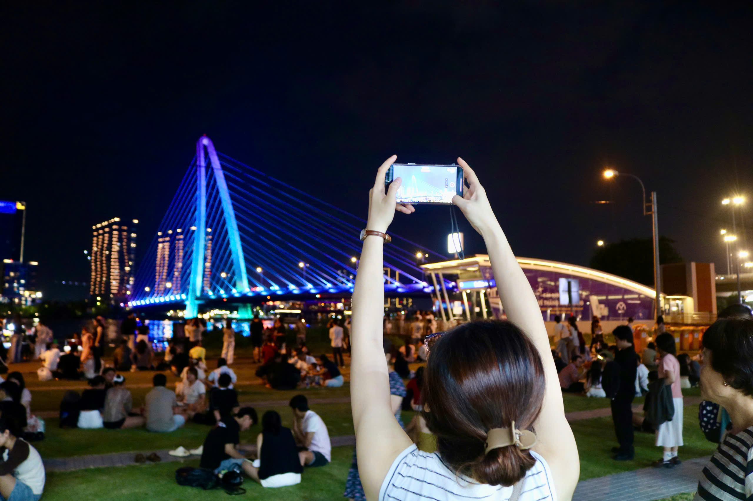 Gece ilerledikçe, kalabalık artıyordu; birçok aile ve genç grubu çimlere oturmak için halılar seriyor, çocuklar etrafta koşuyor, yetişkinler nehirden esen serin esinti eşliğinde sohbet ediyor, yemek yiyor ve içiyorlardı. Her köşeden, güzel anları yakalamak için kaldırılmış telefonlar görmek mümkündü.
