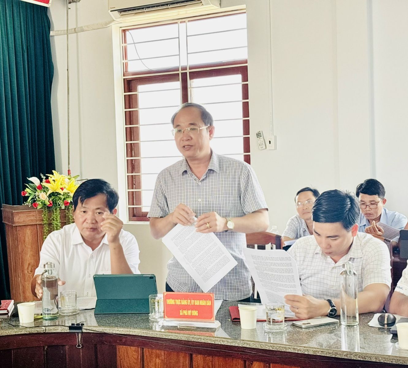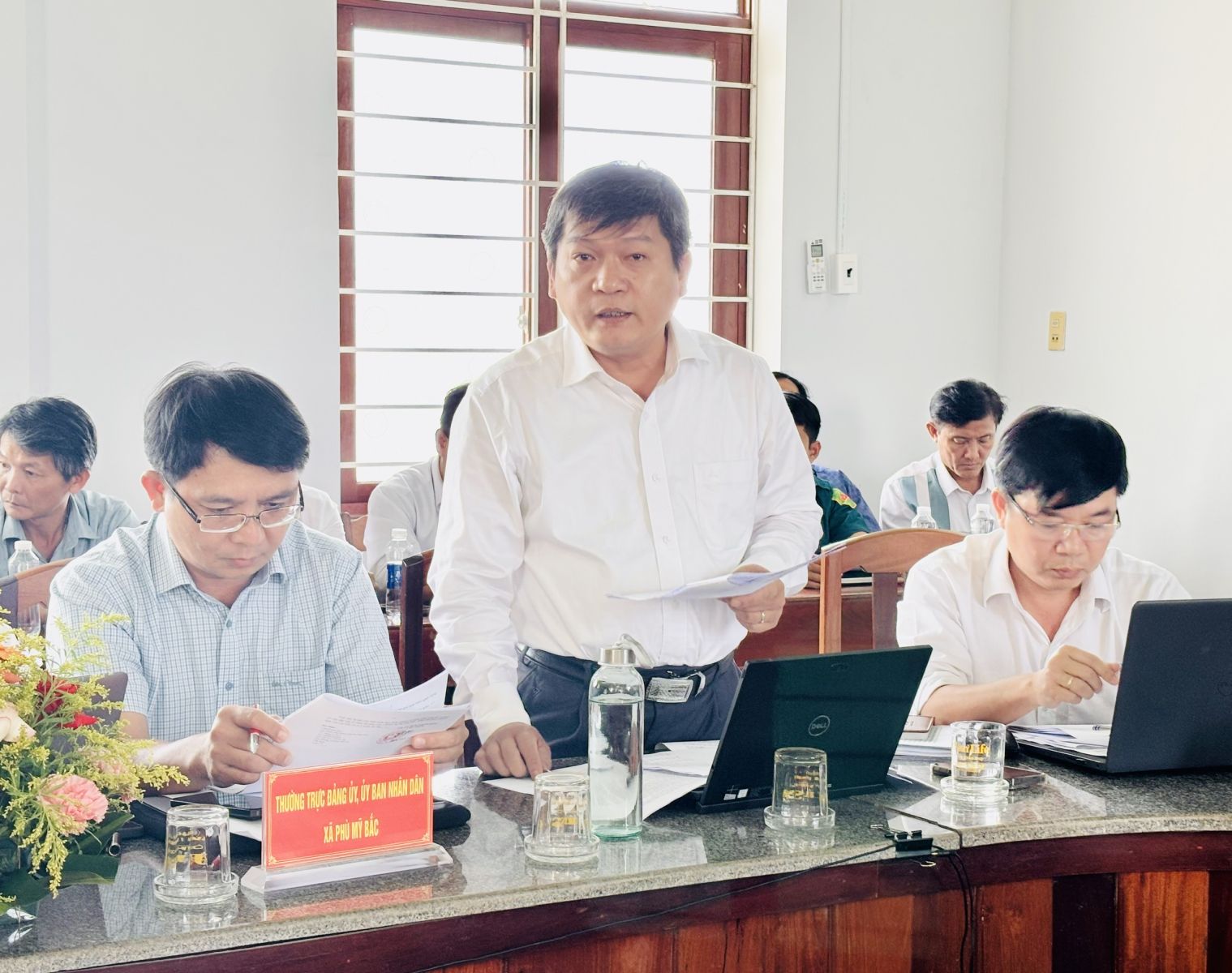 Phu My Bac komün liderleri birleşmeden sonra komünün faaliyetleri hakkında rapor veriyor.