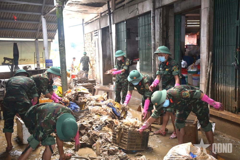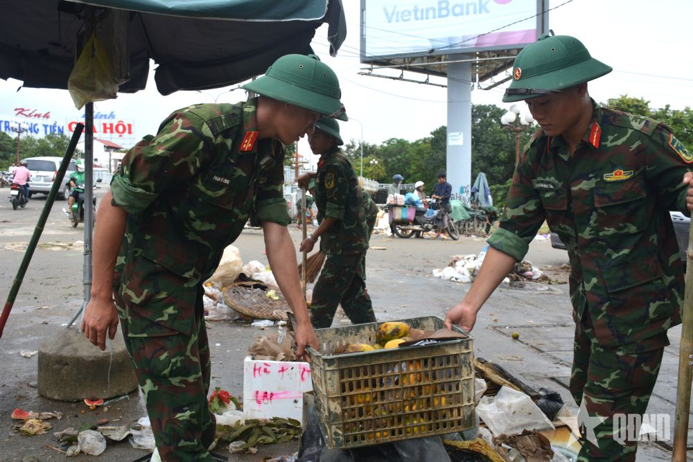 | Askerler Dong Ba pazarındaki temizlik işlerine yardım ediyor. |