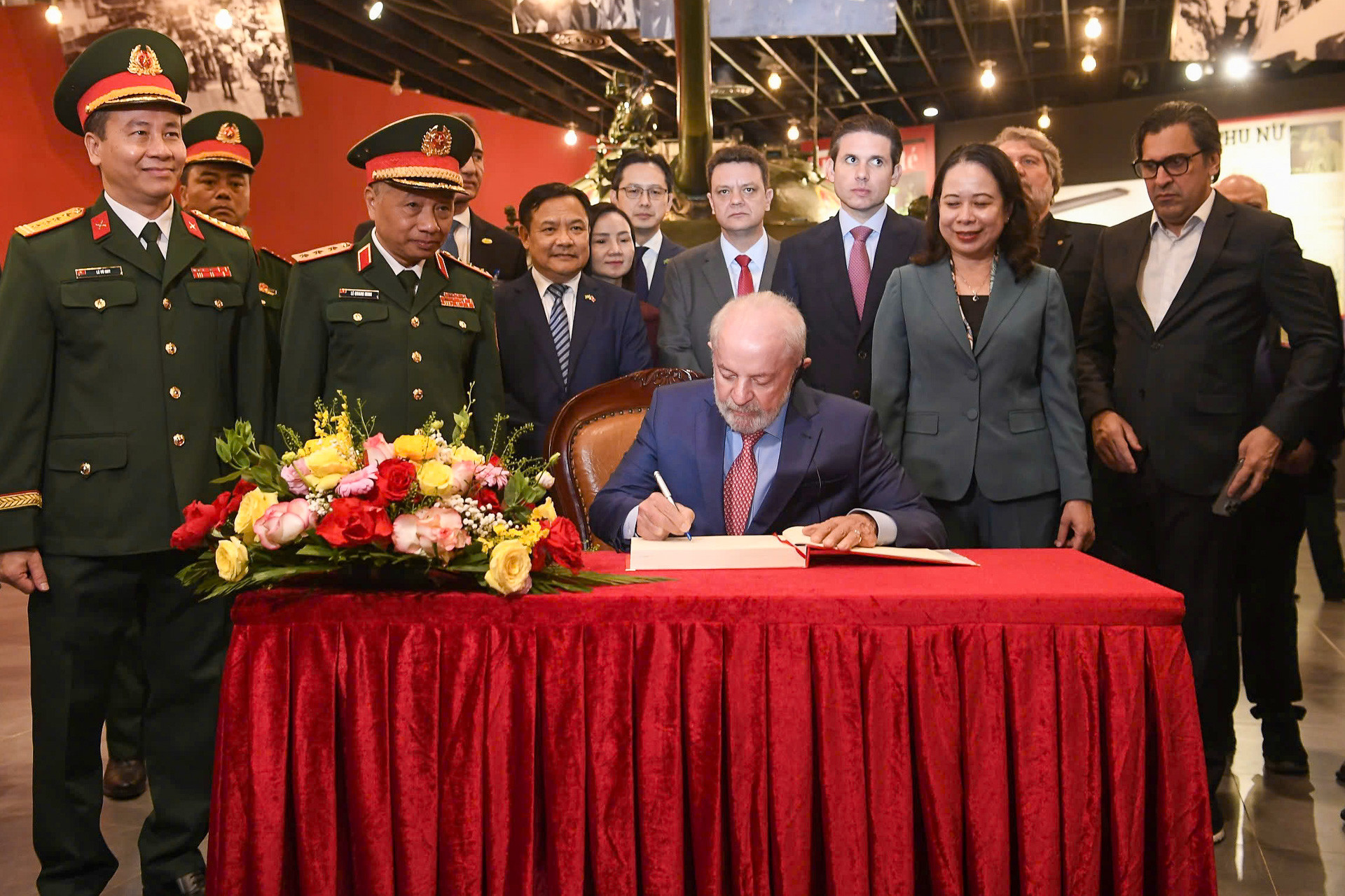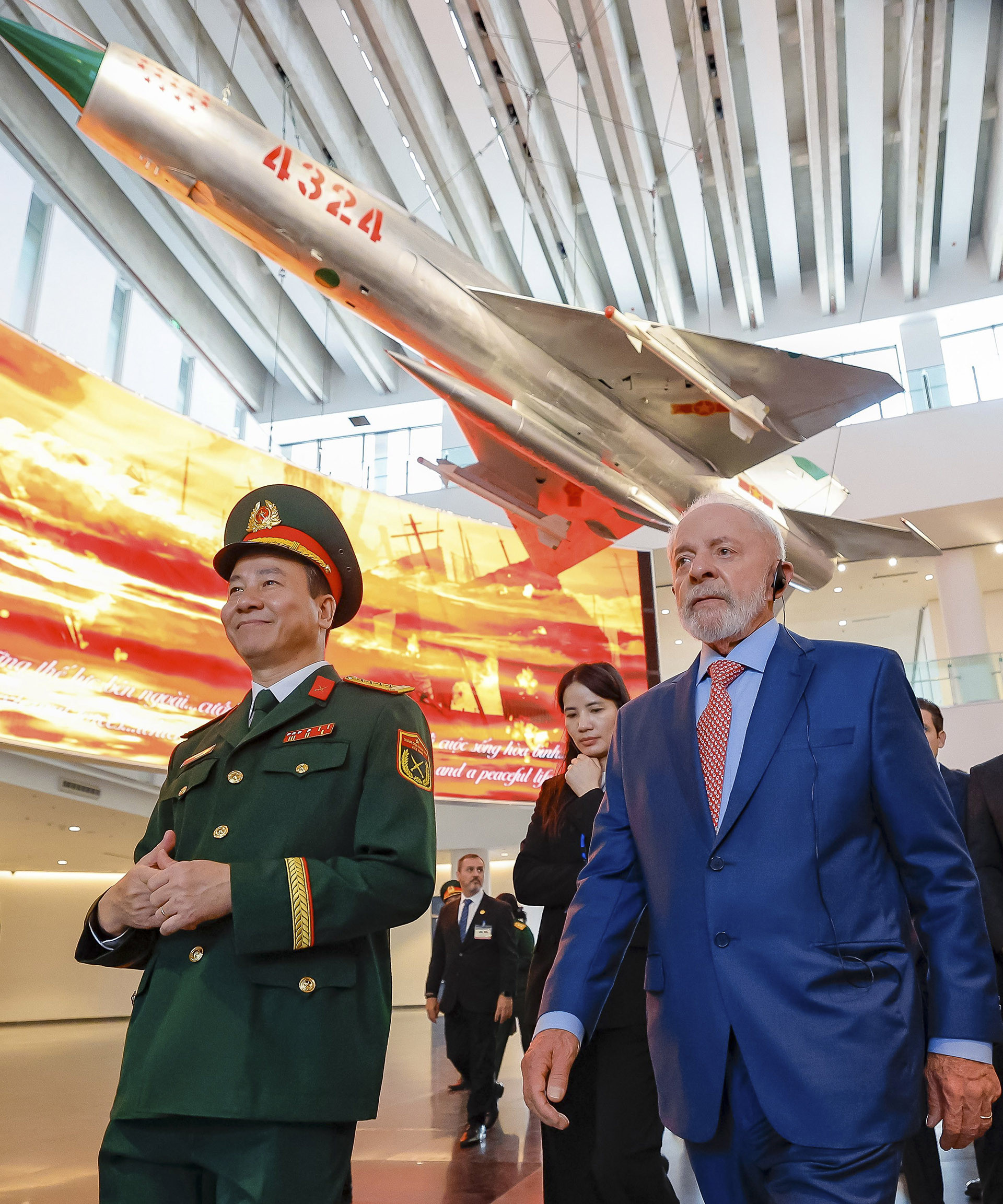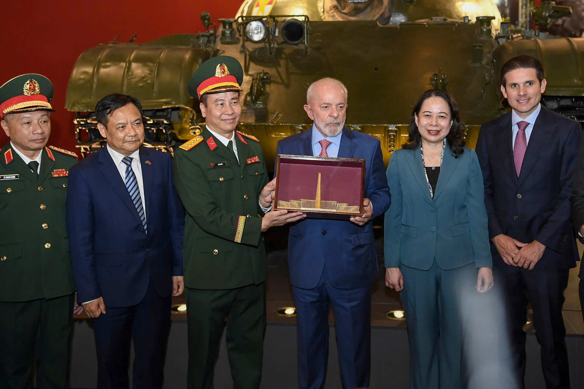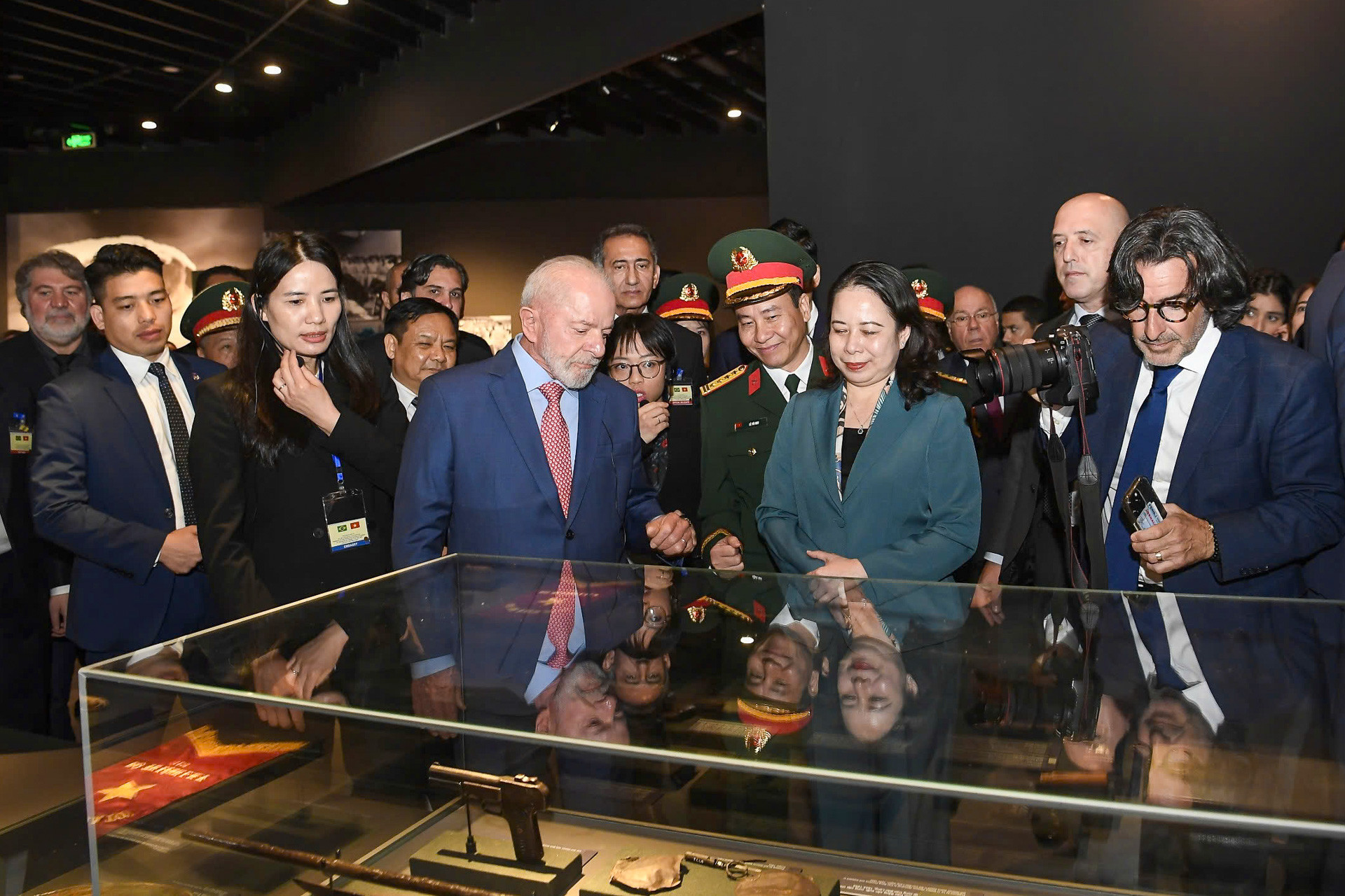 Devlet Başkanı Lula da Silva ve Başkan Yardımcısı Vo Thi Anh Xuan, Vietnam Askeri Tarih Müzesi'nin tanıtımını dinliyor.