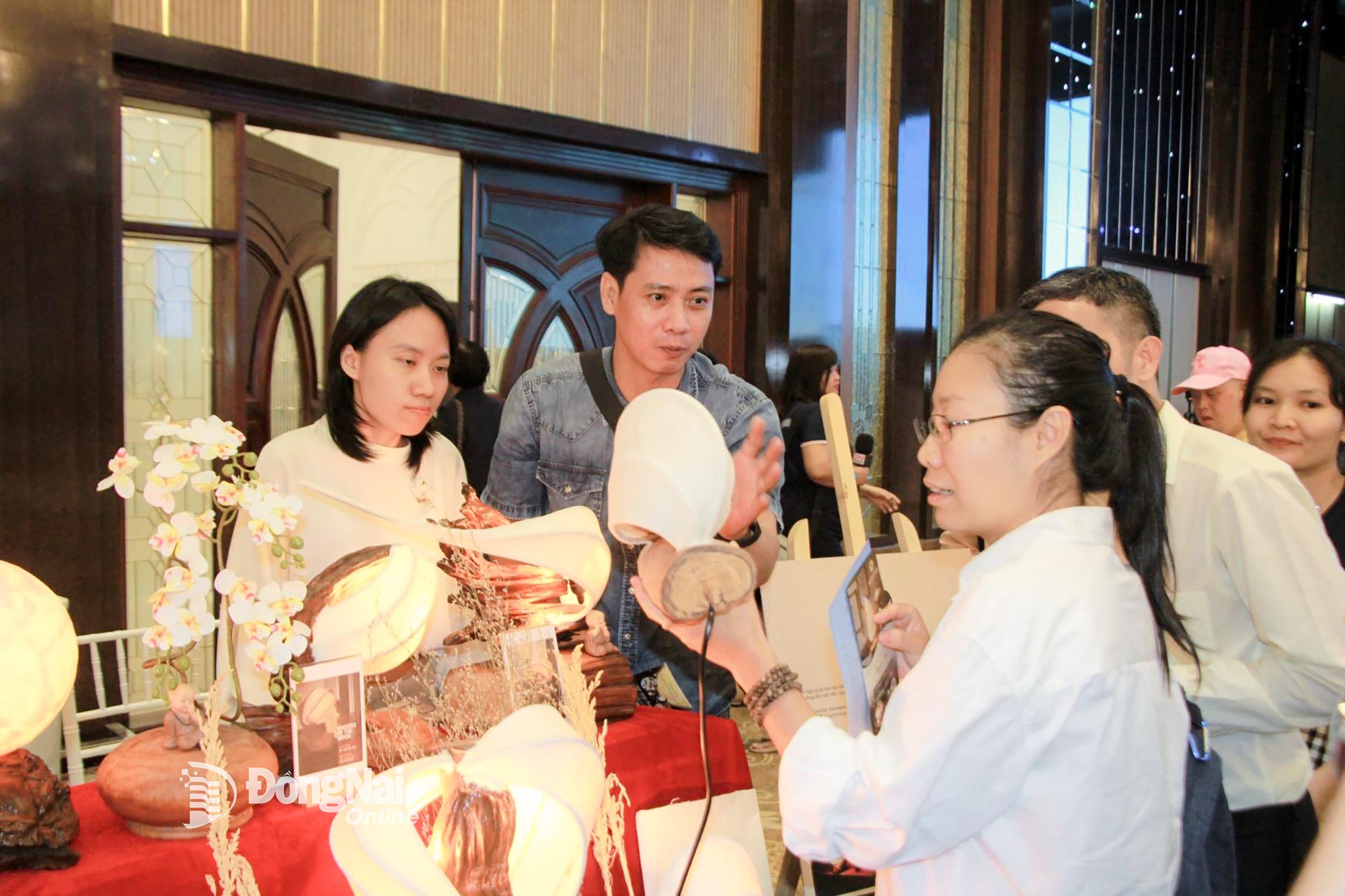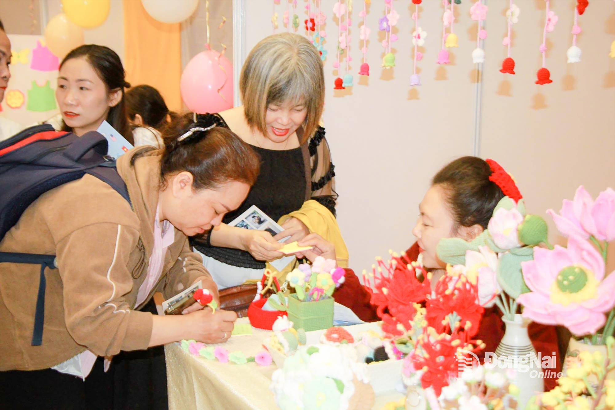 | Delegeler, engelli kadınlar için geçim kaynağı modellerinin sergilendiği standı ziyaret ediyor. Fotoğraf: Nga Son |