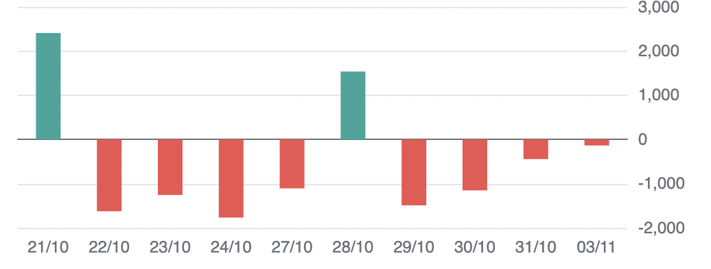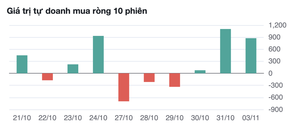 Böylece, 30 Ekim'de 82 milyar VND'lik mütevazı bir net alım hacmiyle birlikte, şimdiye kadar kendi kendine işlem yapanlar, VN Endeksi'nin düşmesi ve bir dizi büyük hisse senedinin fiyatının düşmesi bağlamında, toplam değeri 2.000 milyar VND'yi aşan 3 ardışık net alım seansı gerçekleştirdi.
