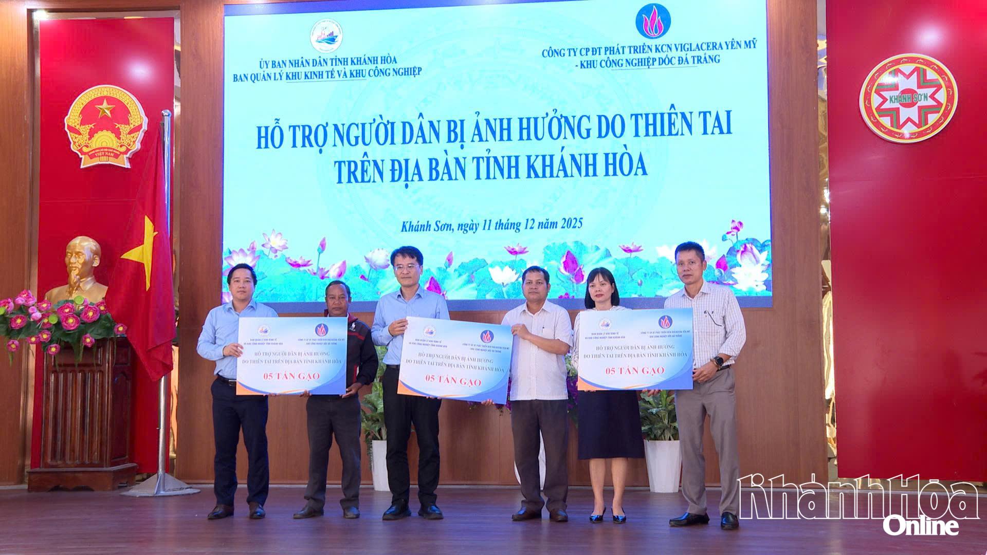 | Ban Quản lý Khu Kinh tế và Khu Công nghiệp tỉnh, Công ty Cổ phần Đầu tư Phát triển Khu Công nghiệp Viglacera Yên Mỹ trao bảng tượng trưng gạo cho các xã khu vực Diên Khánh. |