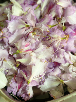 «Коли ви збираєте квіти баугінії, видаляйте старі стебла, зберігайте пелюстки та маточки, мийте їх, бланшуйте в окропі, потім вийміть їх і дайте стекти воді.»