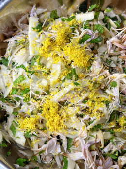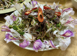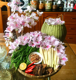 За її словами, перед змішуванням зі спеціями люди часто подрібнюють бланшовані квіти баугінії. Потім додають гіркі пагони бамбука та подрібнені трави, приправляють такими спеціями, як сіль, чилі, часник, цукор, макхен, подрібнений галангал, лимонний сік тощо, і добре перемішують. Зачекайте приблизно 10-15 хвилин, щоб інгредієнти ввібрали смак, а потім додайте подрібнене м’ясо струмкової риби.