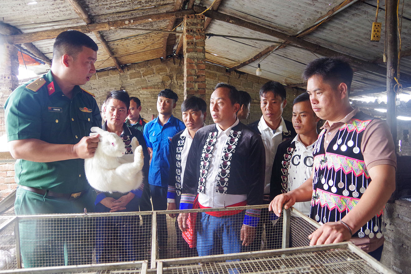 | Офіцери виробничо-будівельної групи № 3, економічно -оборонної групи 356, навчають мешканців села Сін Чай, комуни Дао Сан, провінції Лай Чау, методам вирощування кроликів. |