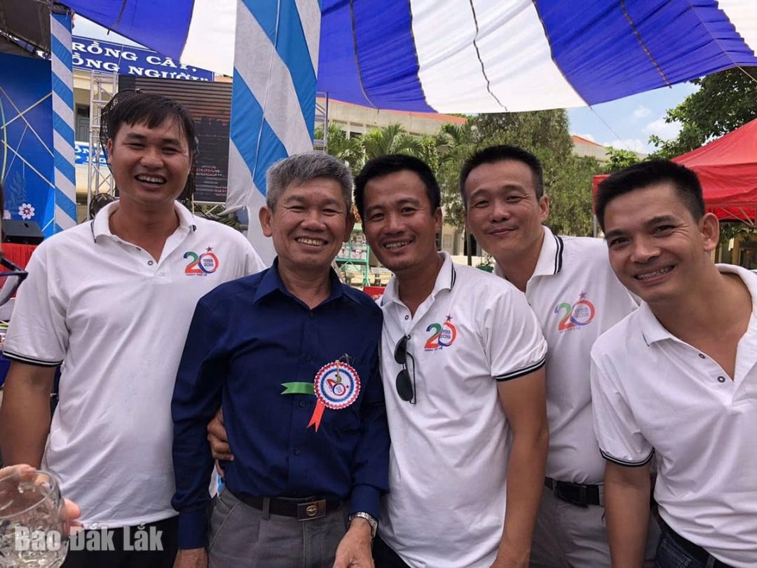 | Вчитель Фам Суан Вінь та колишні учні середньої школи № 1 Ле Хонг Фонг (комуна Еа Пхе) на зустрічі випускників. |