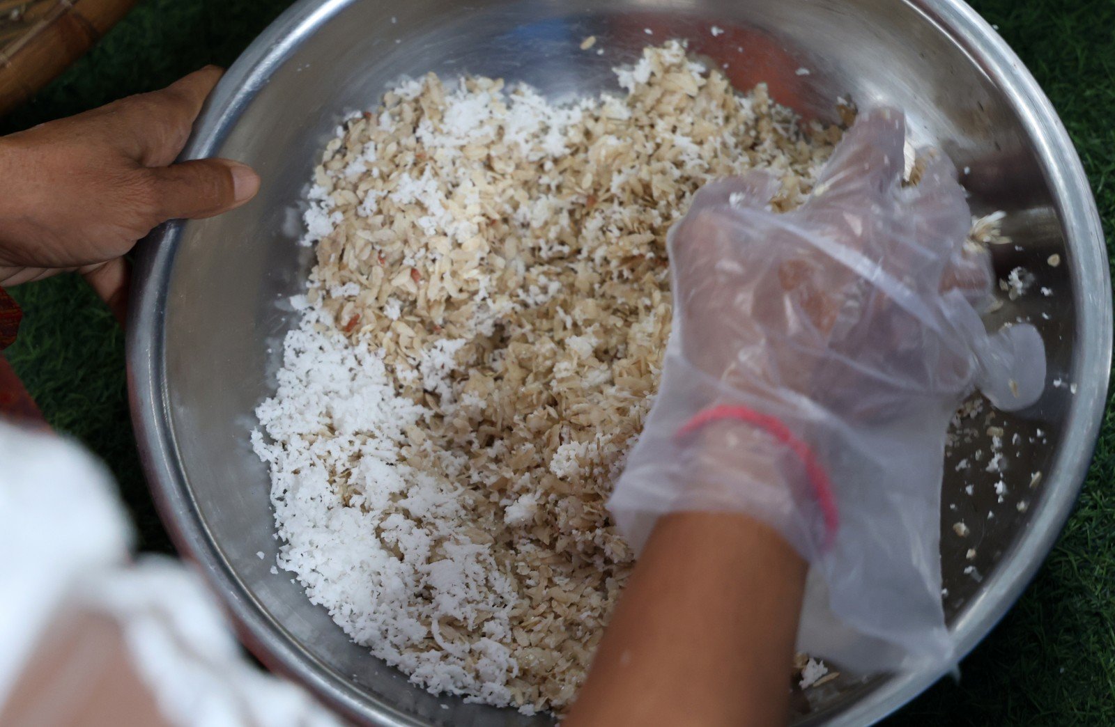 Після того, як клейкий рис подрібнюють, його змішують з цукром, водою та кокосовою стружкою, щоб він пом’якшився, увібрав солодкий і жирний смак і мав більш привабливий аромат.