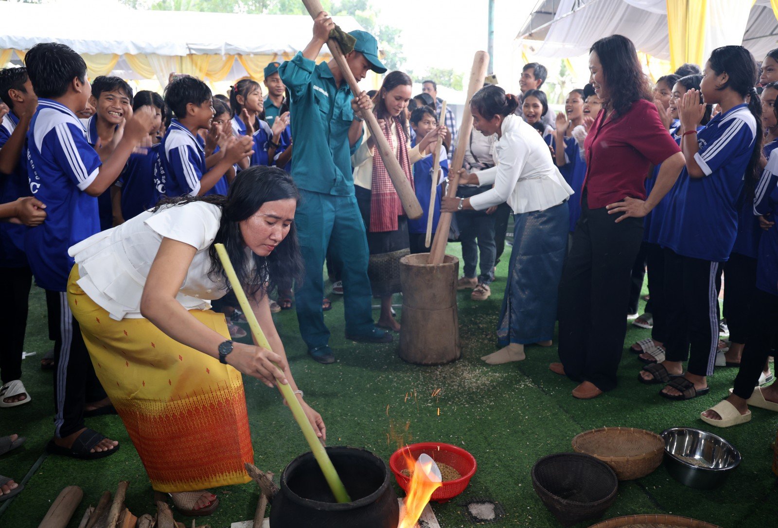 Команда шкільного кластера Тук змагалася у товченні рису в атмосфері захоплених оплесків учнів.