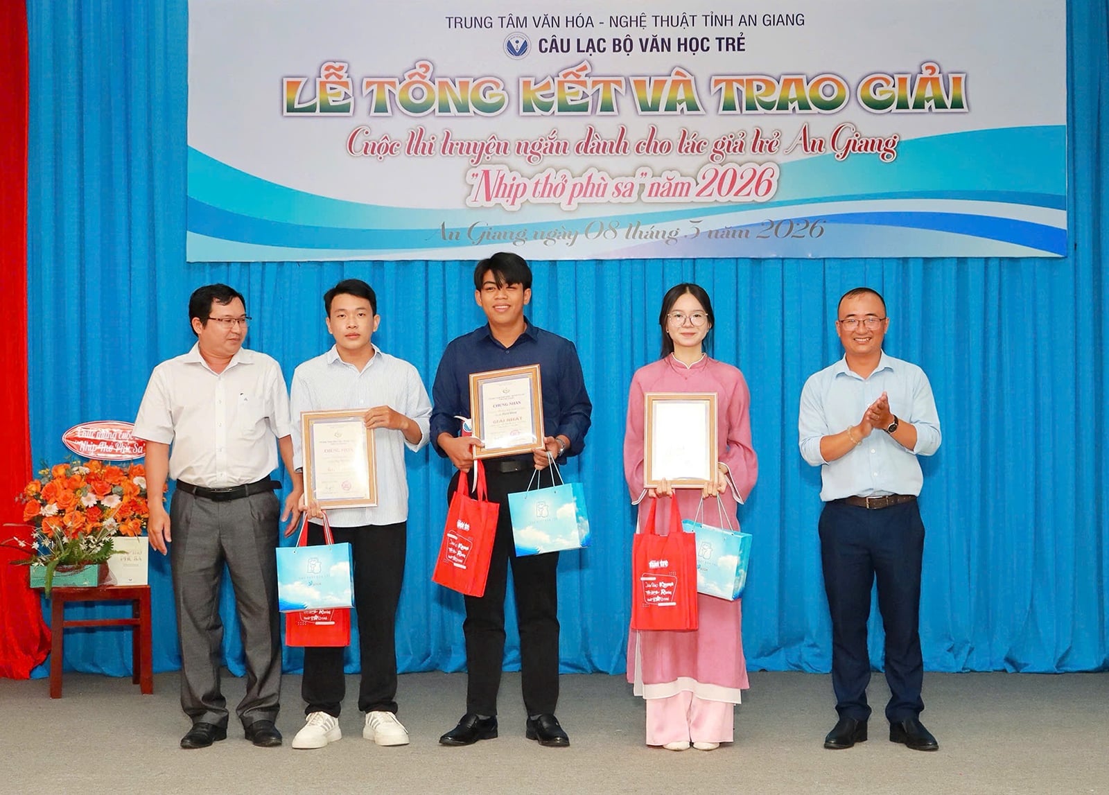 Тран Тхач Кханг (у центрі) отримав перший приз у конкурсі оповідань «Подих алювіального ґрунту». Фото: ТУОНГ ВІ